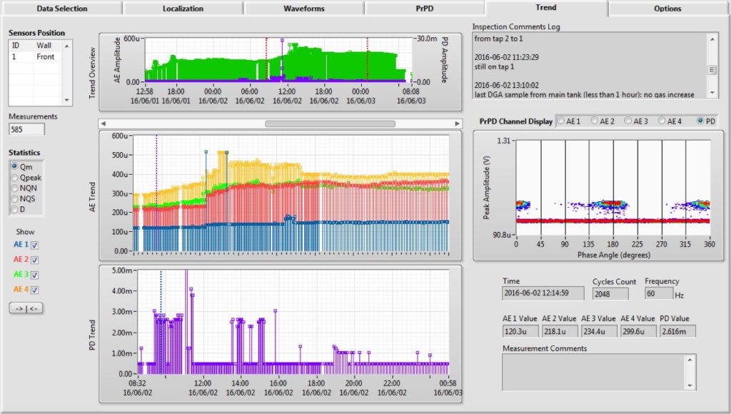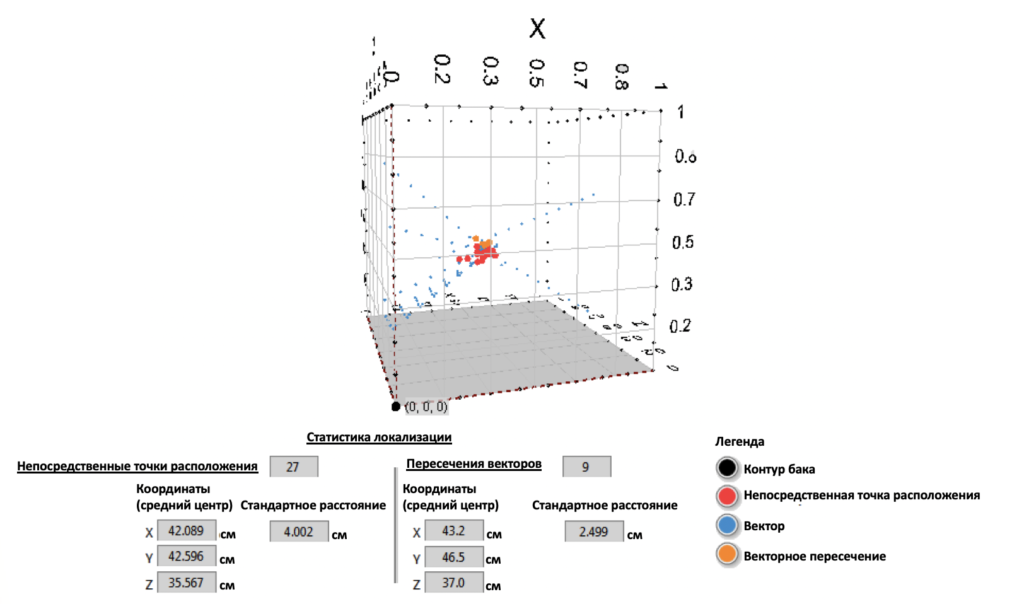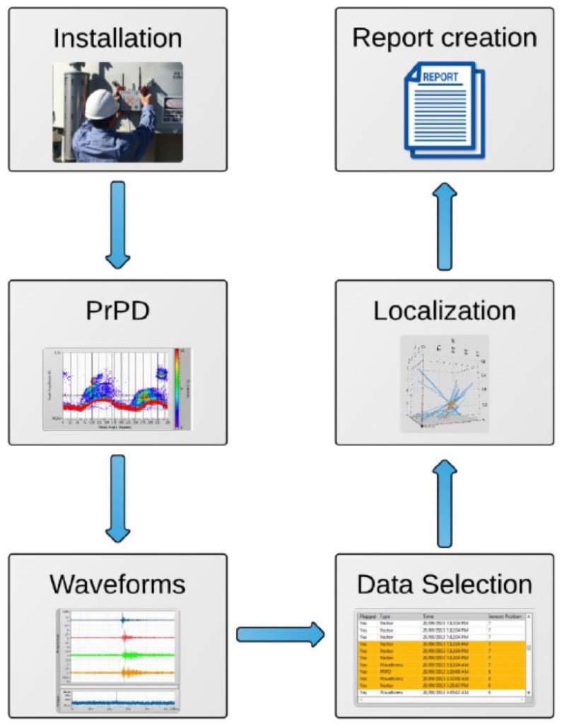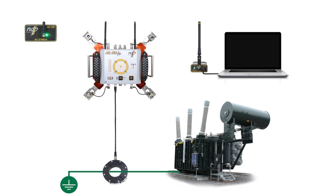 Основной идеей, реализованной в АЕ-150 является сравнение времени прихода сигнала между электромагнитным датчиком (или UHF-антенной) и ультразвуковыми преобразователями. ПО обрабатывает результаты и на основание разности этих показателей строит вектор, который показывает направление точки из которой исходит сигнал. В результате нескольких измерения с разных сторон трансформатора строятся несколько векторов. Места их пересечения и являются точками источника сигнала и предполагаемого места развития частичных разрядов.