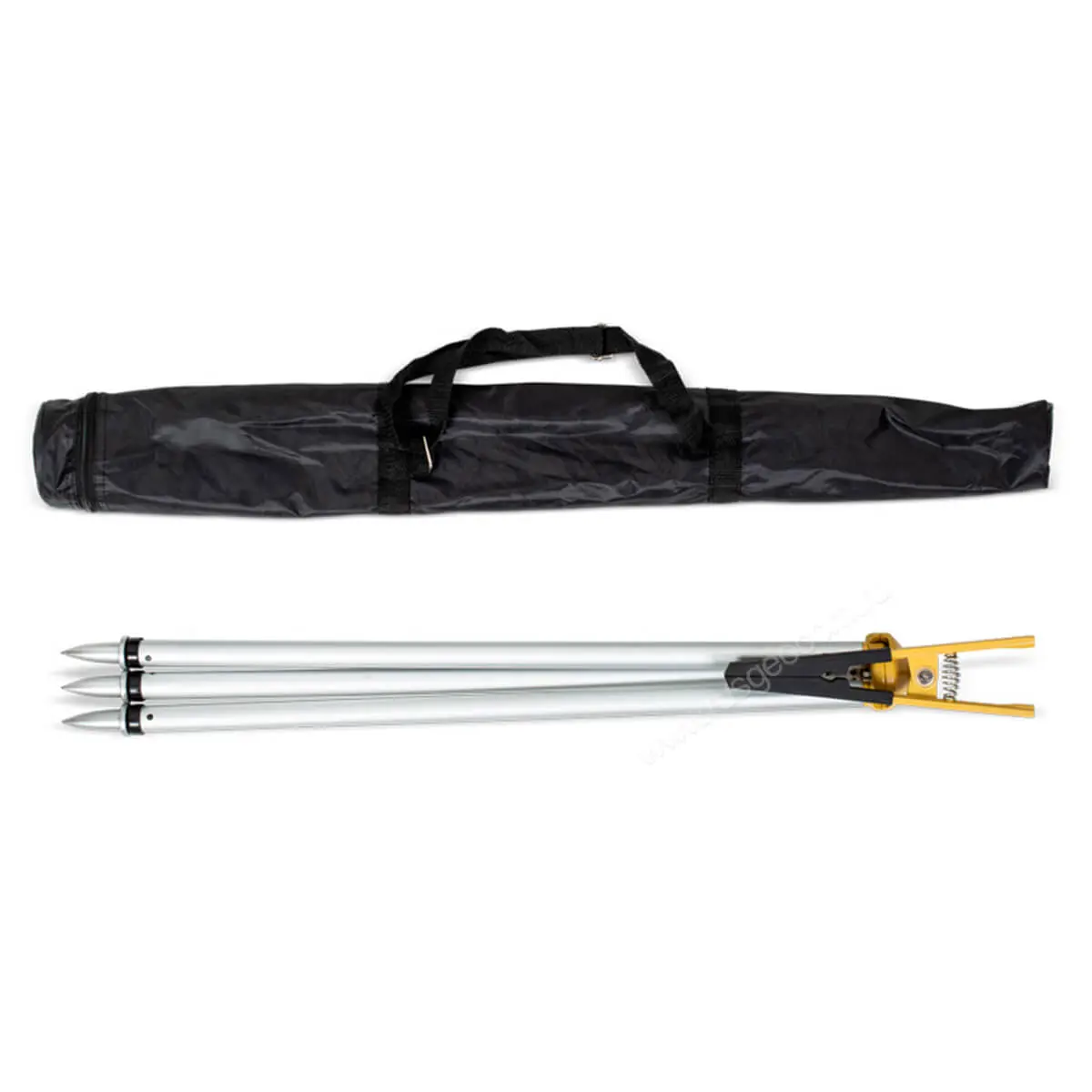 Веха устанавливается на верхнюю часть устройства с помощью прищепки. Приспособление подходит для использования с любыми типами вех диаметром от 25 до 38 мм.