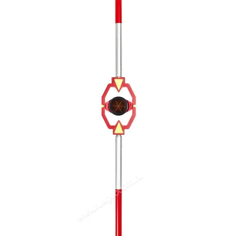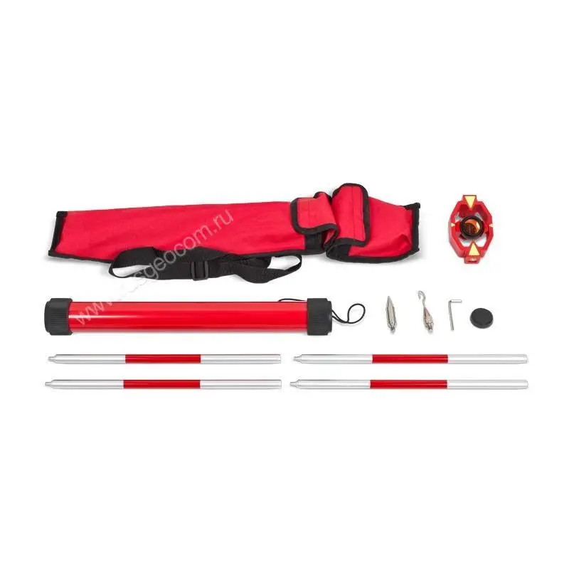В комплекте поставляется разборная металлическая веха, которая позволяет изменять высоту размещения минипризмы вплоть до 1.3 м. В собранном состоянии конструкция из 4 резьбовых секций надежна и стабильна, элементы вехи качественно окрашены и не подвержены коррозии. Заостренный металлический наконечник обеспечивает надежную установку на рыхлых поверхностях, таких как грунт или песок. Также имеется специальный крючок, при помощи которого можно подвесить отражатель в необходимом положении.