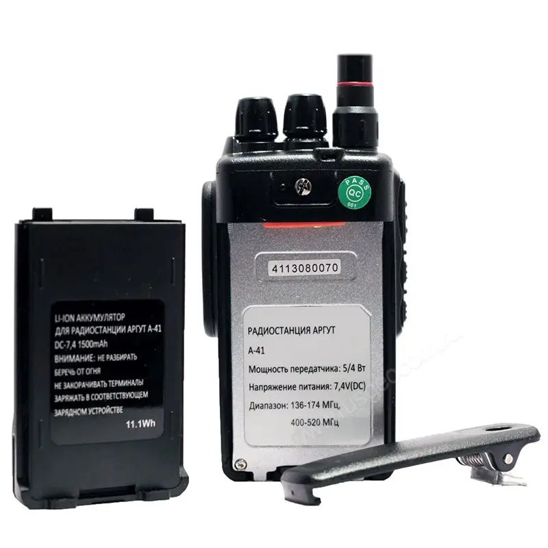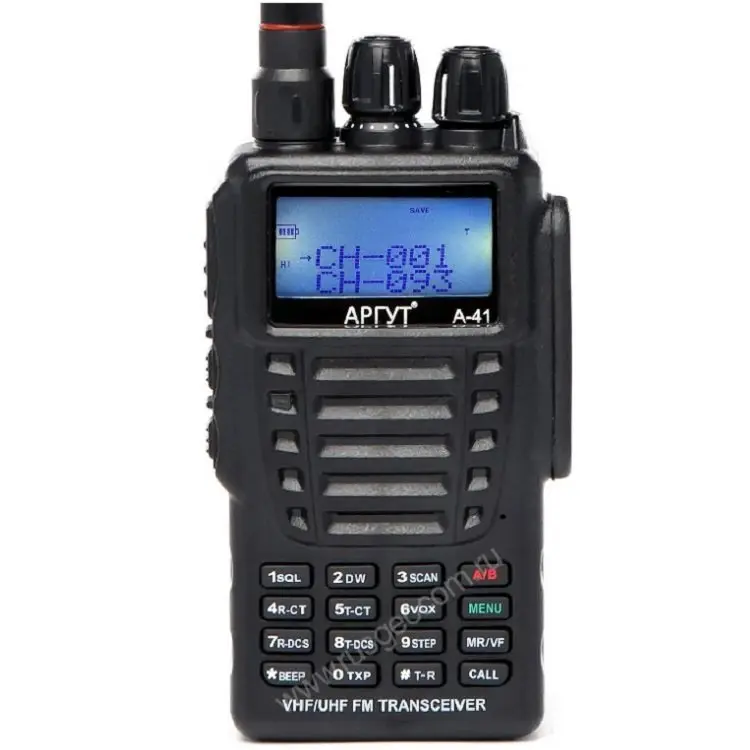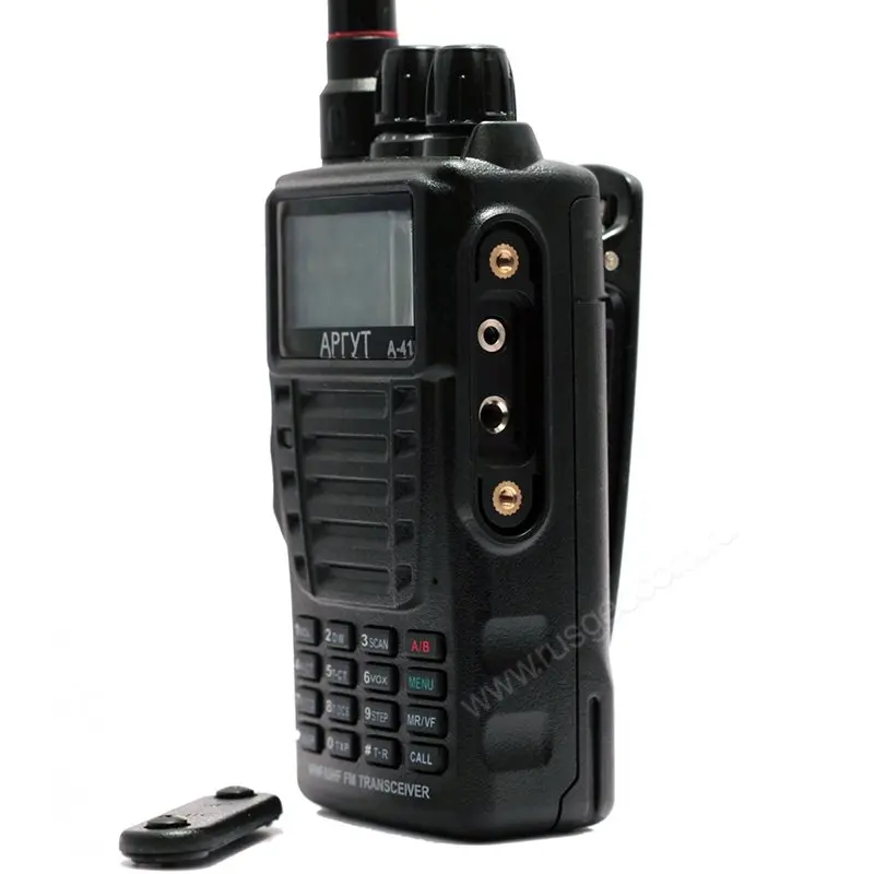 Рация Аргут А-41 new оснащена жидкокристаллическим дисплеем большого размера для контроля частоты и параметров работы, а также двумя приемниками, работающими в VHF и UHF-диапазонах. Подходит для организации гражданской радиосвязи, а также для использования сотрудниками органов внутренних дел.