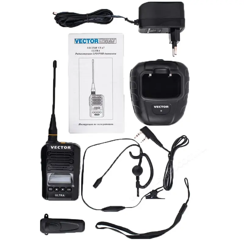 Портативная носимая рация Vector VT-47 Ultra (Вектор ВТ-47 Ультра) имеет ударопрочное исполнение, выполнена на основе шасси из алюминия, корпус из специального пластика. Работает в диапазонах LPD/PMR (433/446 МГц) на трех уровнях мощности – от 0,3 до 5 Вт. Понижение уровня предусмотрено для экономии заряда аккумулятора. С помощью опций меню можно также регулировать громкость. Устройство оснащено функцией голосового управления VOX с разными уровнями чувствительности. Емкий аккумулятор на 1500 мАч выдерживает 40 часов в режиме ожидания без подзарядки.