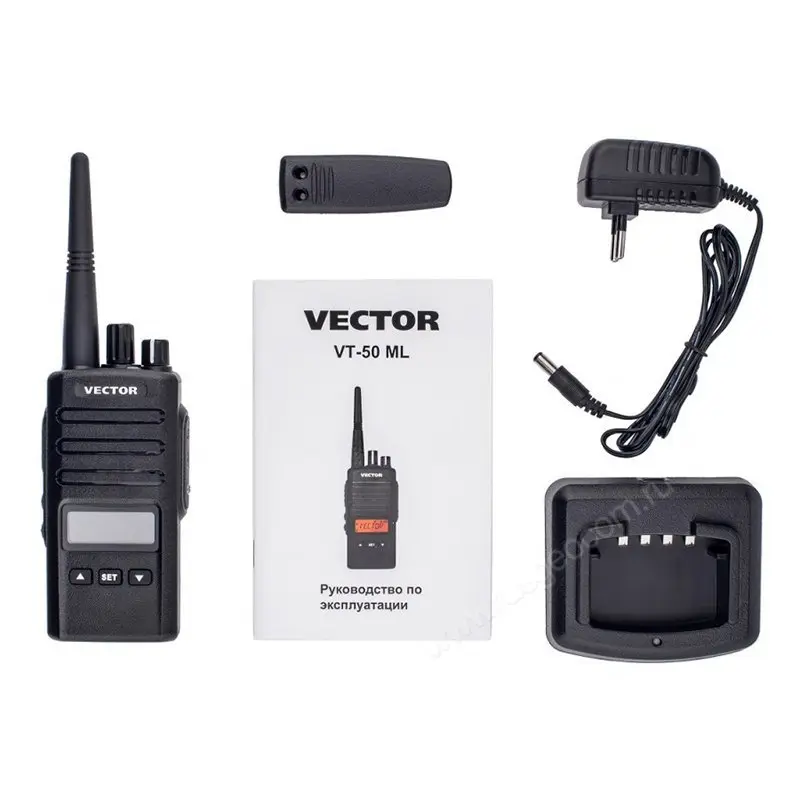 На рации имеется жидкокристаллический экран для отображения номеров каналов и других параметров работы рации. Предусмотрены дополнительные кнопки для доступа к важным функциям прибора. Программирование и настройка рации Vector VT-50 ML осуществляются с компьютера, для чего в комплект входит программатор.