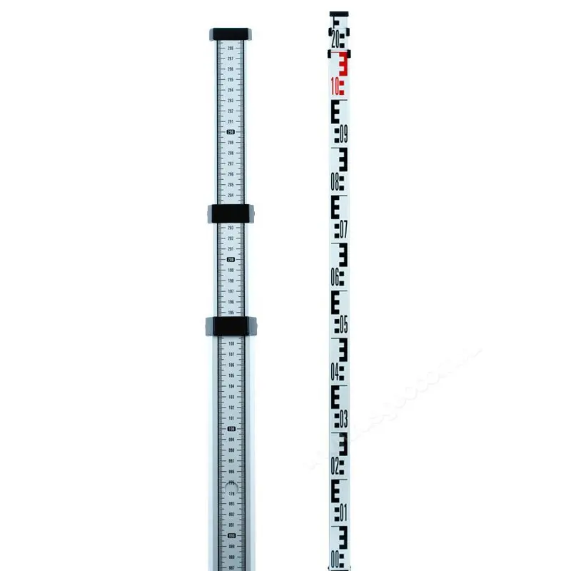 Шкала "Е" с лицевой стороны красно/черного цвета и миллиметровая шкала с оборотной стороны. Миллиметровая шкала начинает отсчет от нижней части рейки, шкала нанесена на всех 3-х секциях рейки снизу до верху.