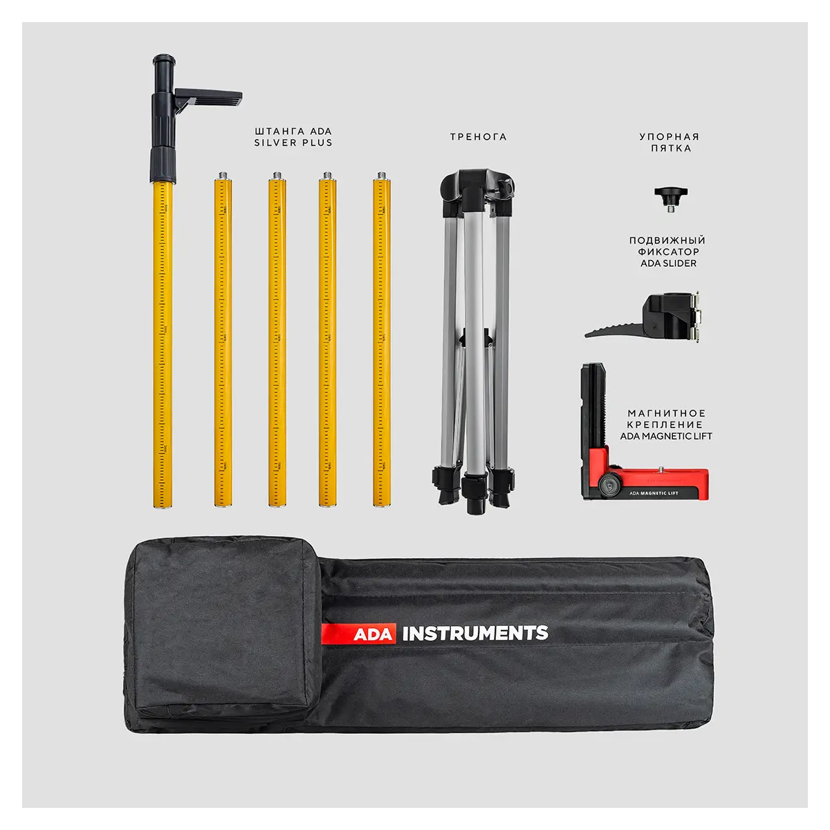 Для транспортировки и хранения ADA Silver PLUS с треногой весь разобранный комплект укладывается в специальную сумку.