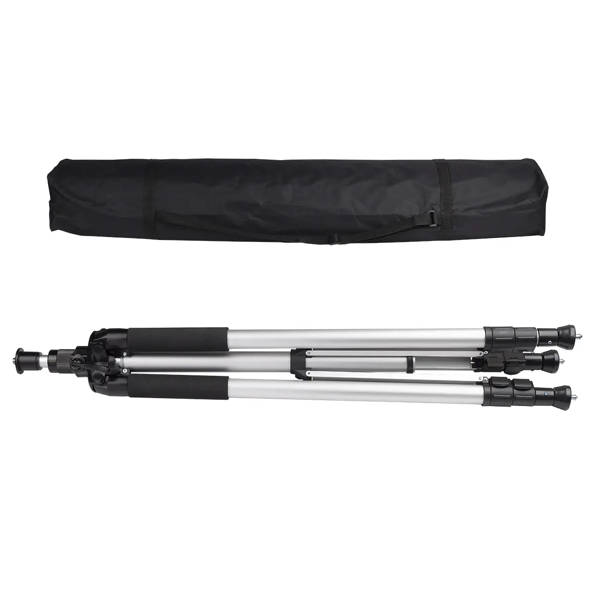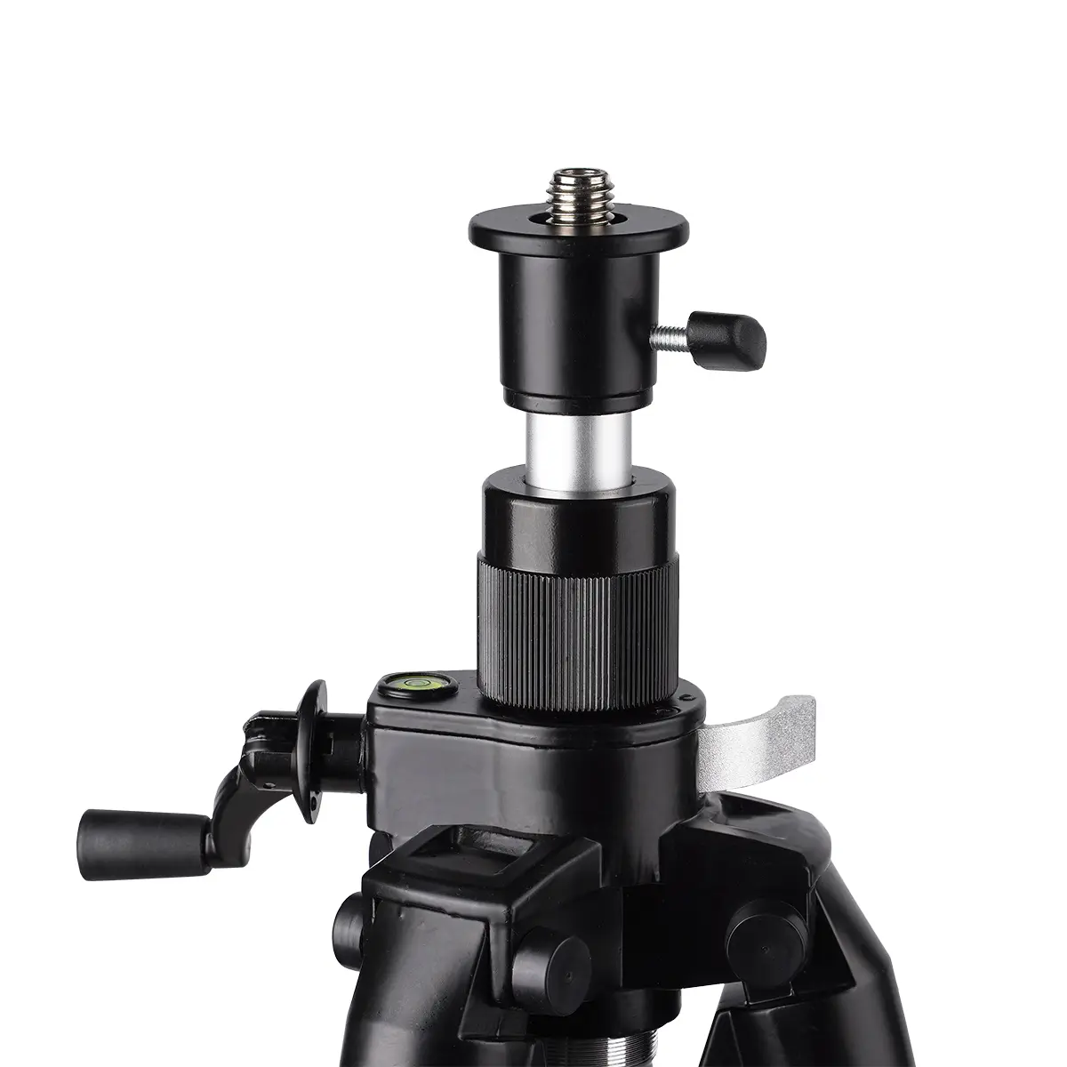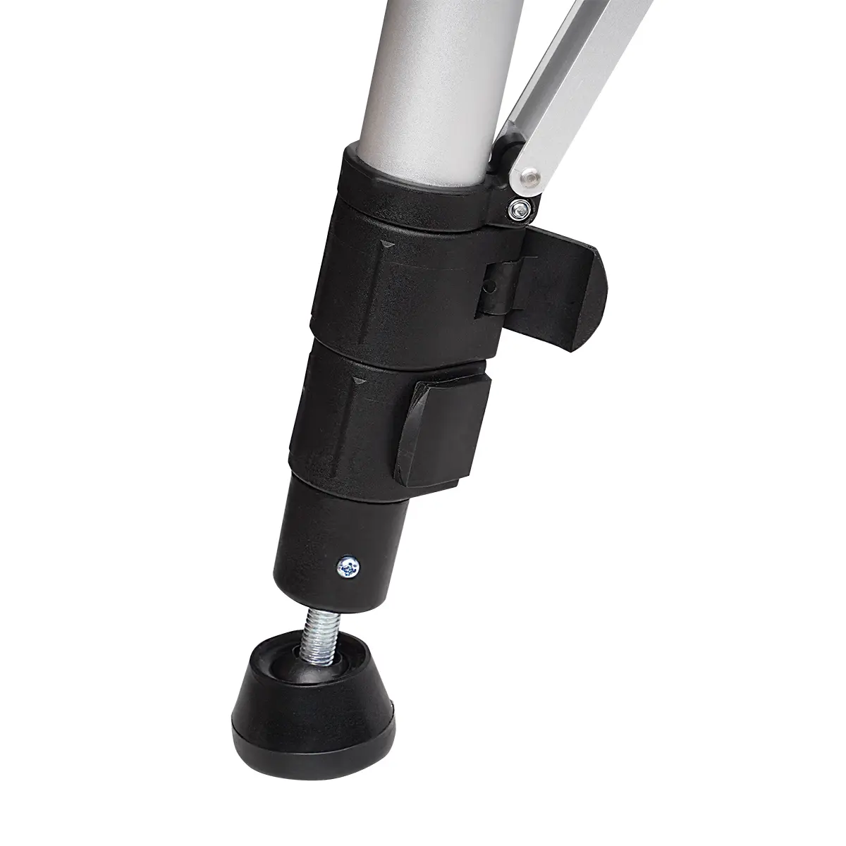 В данной модели используются быстродействующие зажимы выдвижных элементов флажкового типа, что упрощает и ускоряет развертывание и свертывание инструмента. Для повышения устойчивости конструкции распорки ножек фиксируются в рабочем положении при помощи винтового зажима. Опоры снабжены винтовыми регуляторами для тонкого горизонтирования штатива и шаровыми соединителями, обеспечивающими свободное перемещение башмаков для надежного контакта с поверхностью.