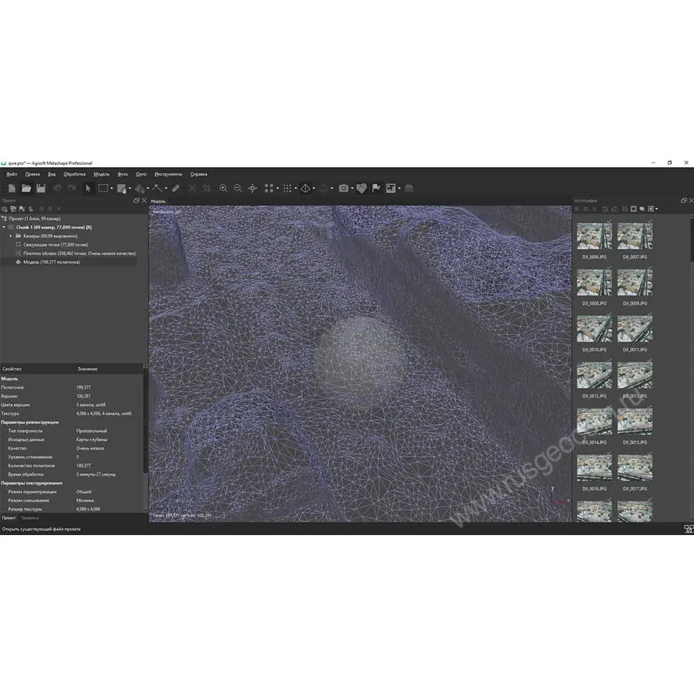 Обработка различных типов снимков: аэрофотосъемка (надирная, перспективная), фотосъёмка с близкого расстояния. Автоматическая калибровка: различные типы камер (включая "рыбий глаз"), сферические и цилиндрические камеры. Поддержка нескольких проектов с разными камерами. Работа с плотным облаком точек
