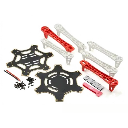Основой гексакоптера DJI F550 ARF KIT служит рама с интегрированной в неё печатной платой для разводки проводов. К двум пластинам в центре крепятся шесть лучей красного и белого цвета. Легкий и прочный композитный материал, из которого изготовлена рама, не утяжеляет конструкцию и обеспечивает её устойчивость к ударам и позволяет выдержать многократные неосторожные приземления. Рама выдержит не только стандартный набор из регуляторов, моторов и пропеллеров, но и поднимет в воздух контроллер, GPS навигатор и подвес с камерой.