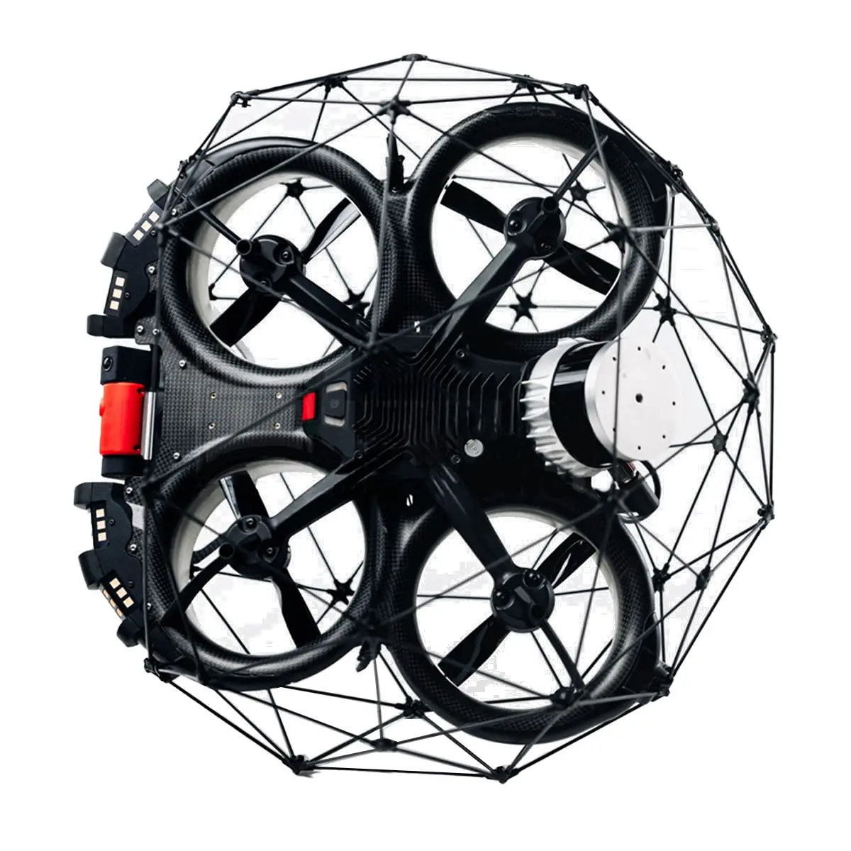 Специально разработанный для применения в узких и труднодоступных местах, инспекционный дрон Elios 3 снабжен интегрированной защитой винтов, более эффективной, по сравнению с моделями предыдущих ревизий. Выполняя также роль направляющих воздухопроводов, она минимизирует вероятность всасывания посторонних предметов. Каркасная оболочка сферической формы из углепластика с эластичными сочленениями предохраняет конструкцию от повреждений при столкновениях, восстанавливая свою форму без остаточной деформации. Для упрощения доступа к батарее и полезной нагрузке в каркасе предусмотрены соответствующие окна. Реверсивные приводы способны быстро менять направление тяги, обеспечивая улучшенную маневренность и упрощая переворачивание в случае опрокидывания.