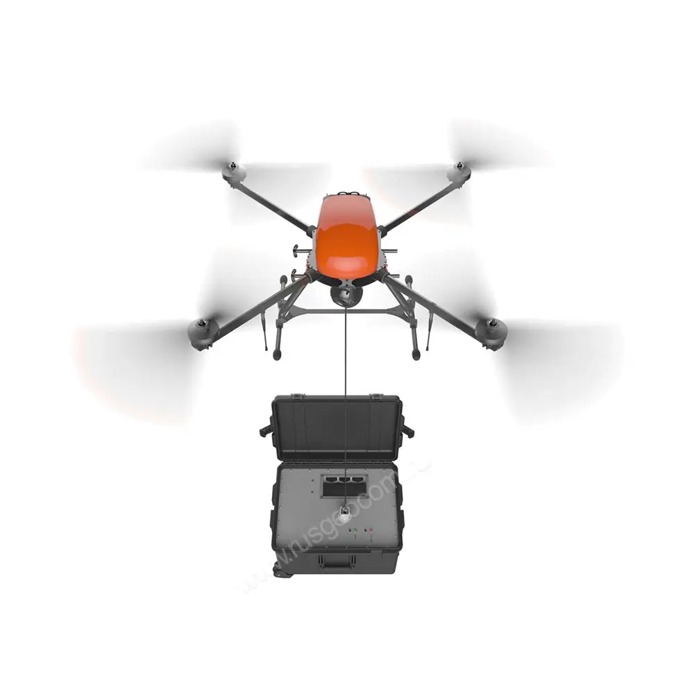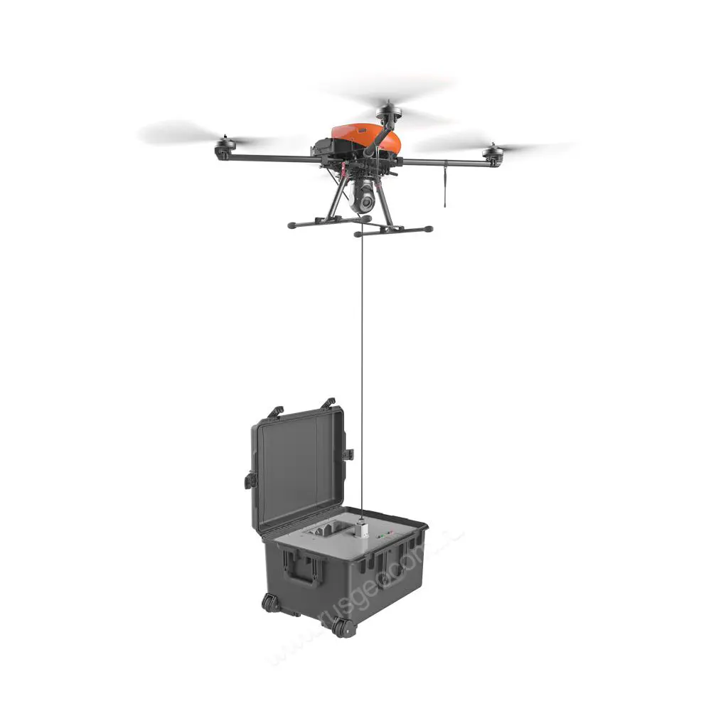 При стационарном размещении питание коптера 401 Привязной может быть организовано как от сети, так и от генератора. Предусмотрена резервная батарея для аварийной посадки при непредвиденном отключении питания. Сильные порывы ветра оперативно компенсируются система автоматического натяжения кабеля.