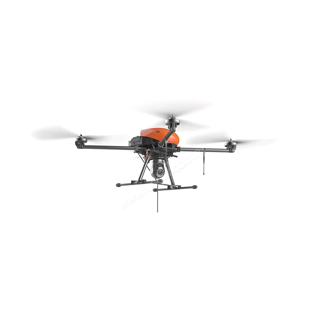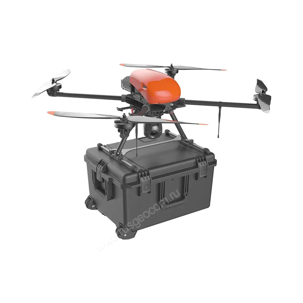 Квадрокоптер Геоскан 401 Привязной предназначен для решения широкого спектра задач, подразумевающих стационарную установку с полетом на высоте до 100 м на протяжении до 72 ч. При таком формате работы дрон постоянно подключен к наземному блоку, с которого подается питание и на который транслируются данные с полезной нагрузки, размещенной на квадрокоптере Геоскан.