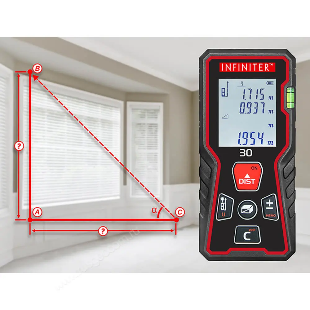С помощью INFINITER 30 вы сможете произвести расчет площади и объёма, сложение и вычитание длины. Функция вычисления по теореме Пифагора существенно упростит работу с измерениями в труднодоступных местах, а также при наличии объектов и элементов, препятствующих отражению лазерного луча от измеряемой поверхности. Трекинг пригодится для проведения непрерывного измерения расстояний.