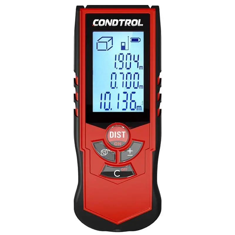 Дисплей лазерного дальномера CONDTROL X1 Plus трёхстрочный с дополнительным полем для отображения текущего режима измерения, уровня заряда батарей и прочей вспомогательной информации. Считывание показаний происходит комфортно с любых положений, а для работы в условиях недостаточной освещённости предусмотрена подсветка.