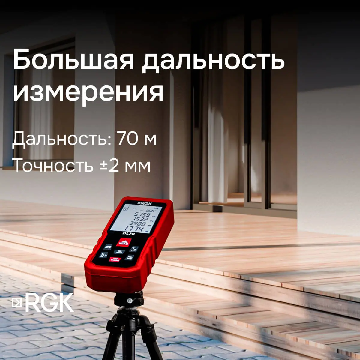 Корпус RGK DL70 (с поверкой) изготовлен в соответствии с классом пыле-влагозащиты IP54. Прибор можно использовать даже на запыленных стройплощадках или во время дождя. Для установки дальномера на штатив предусмотрено крепление 1/4".