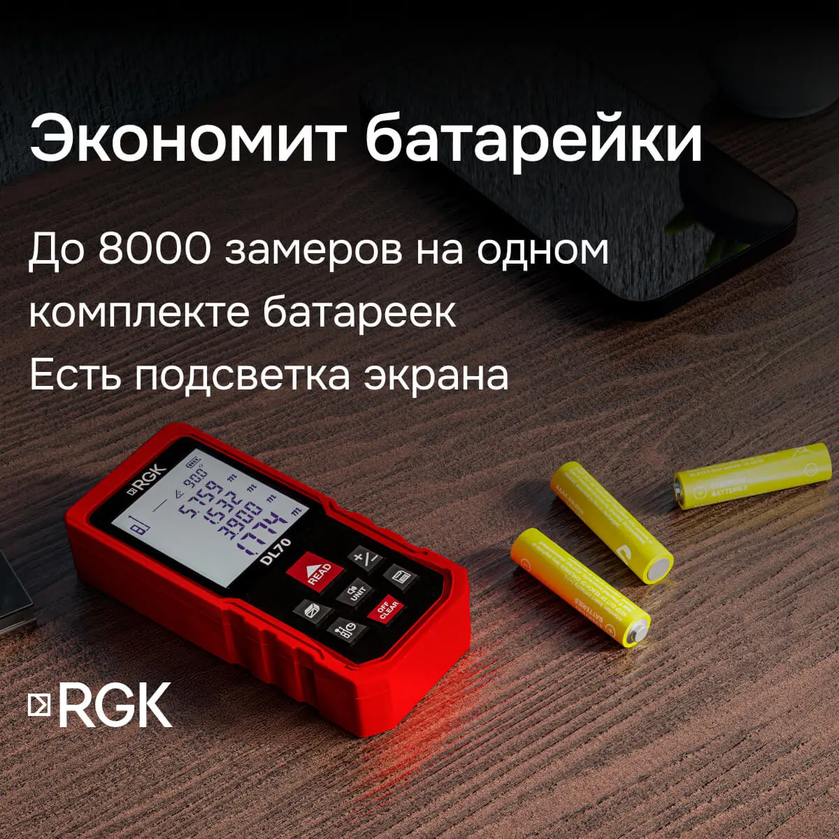Питание лазерного дальномера RGK DL70 (с поверкой) осуществляется от трех батареек типа ААА или аккумуляторов аналогичного формата. Одного комплекта батарей хватает для 8000 измерений. Для экономии заряда лазер и подсветка экрана автоматически отключаются через 20 секунд, а сам прибор - через 2,5 минуты.