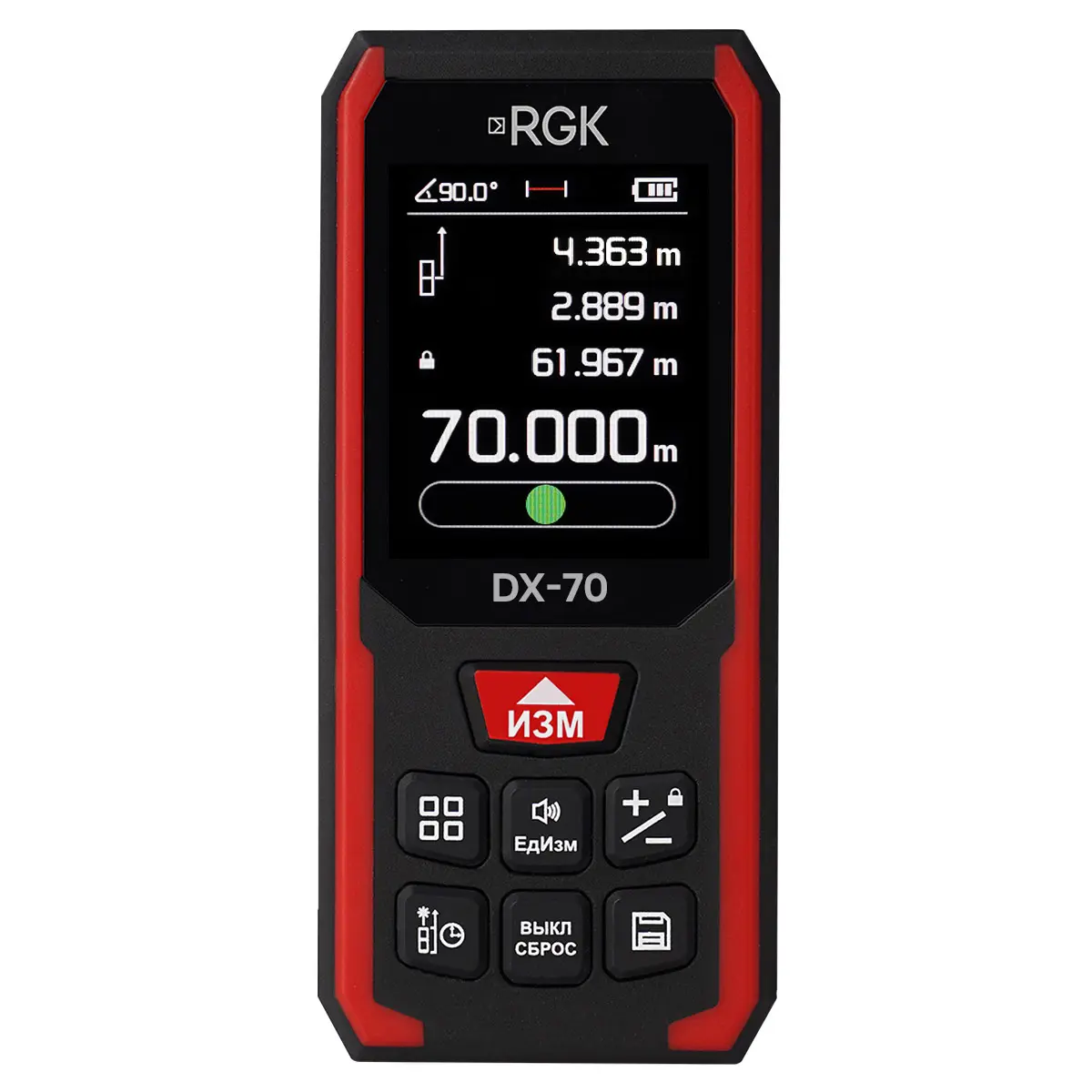 Лазерный дальномер RGK DX70 представляет собой высокопроизводительный прибор строительного назначения в прочном двухслойном корпусе, предназначенный для определения размеров и дистанций до целевых объектов на расстоянии до 70 м, а также способный выполнять измерения уклонов благодаря встроенному инклинометру. От лазерных рулеток других, более дешевый серий данного бренда, с таким же измерительным диапазоном, прибор отличается улучшенной точностью, обеспечивая погрешность линейных измерений не более ±1,5 мм, поддержкой расширенного перечня режимов и высокой наглядностью, что обеспечивает цветной графический дисплей.
