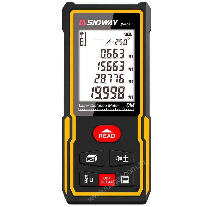 Лазерная рулетка SNDWAY SW-DS60 отличается точностью полученных значений, при этом всегда можно активировать задержку измерения для того, чтобы правильно выставить устройство, навестись на цель и снизить влияние дрожания рук на результат.