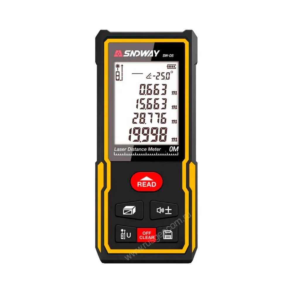 Лазерная рулетка SNDWAY SW-DS80 отличается точностью полученных значений, при этом всегда можно активировать задержку измерения для того, чтобы правильно выставить устройство, навестись на цель и снизить влияние дрожания рук на результат.