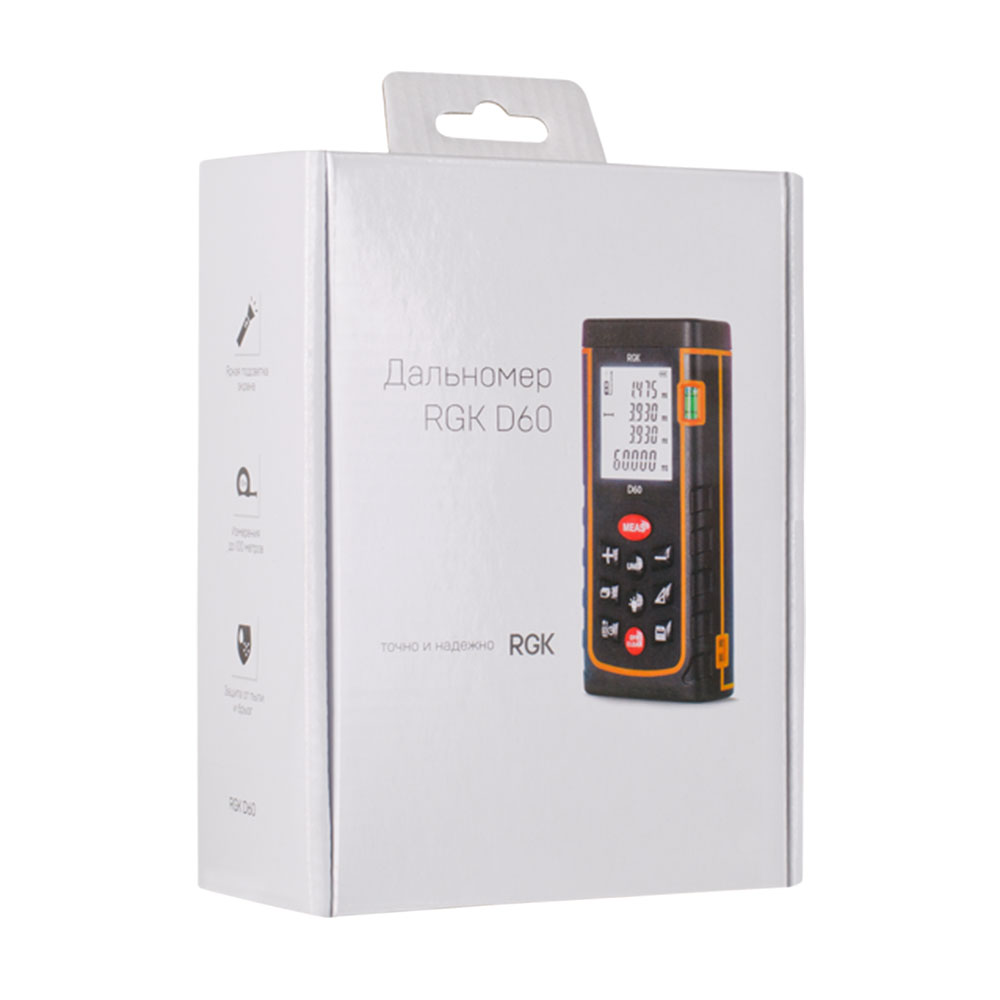 Точность измерений — не менее ±2 мм. При этом вы получите не только точные, но и достоверные данные: лазерный дальномер RGK D60 оснащён пузырьковым уровнем для гарантированного получения перпендикуляра.