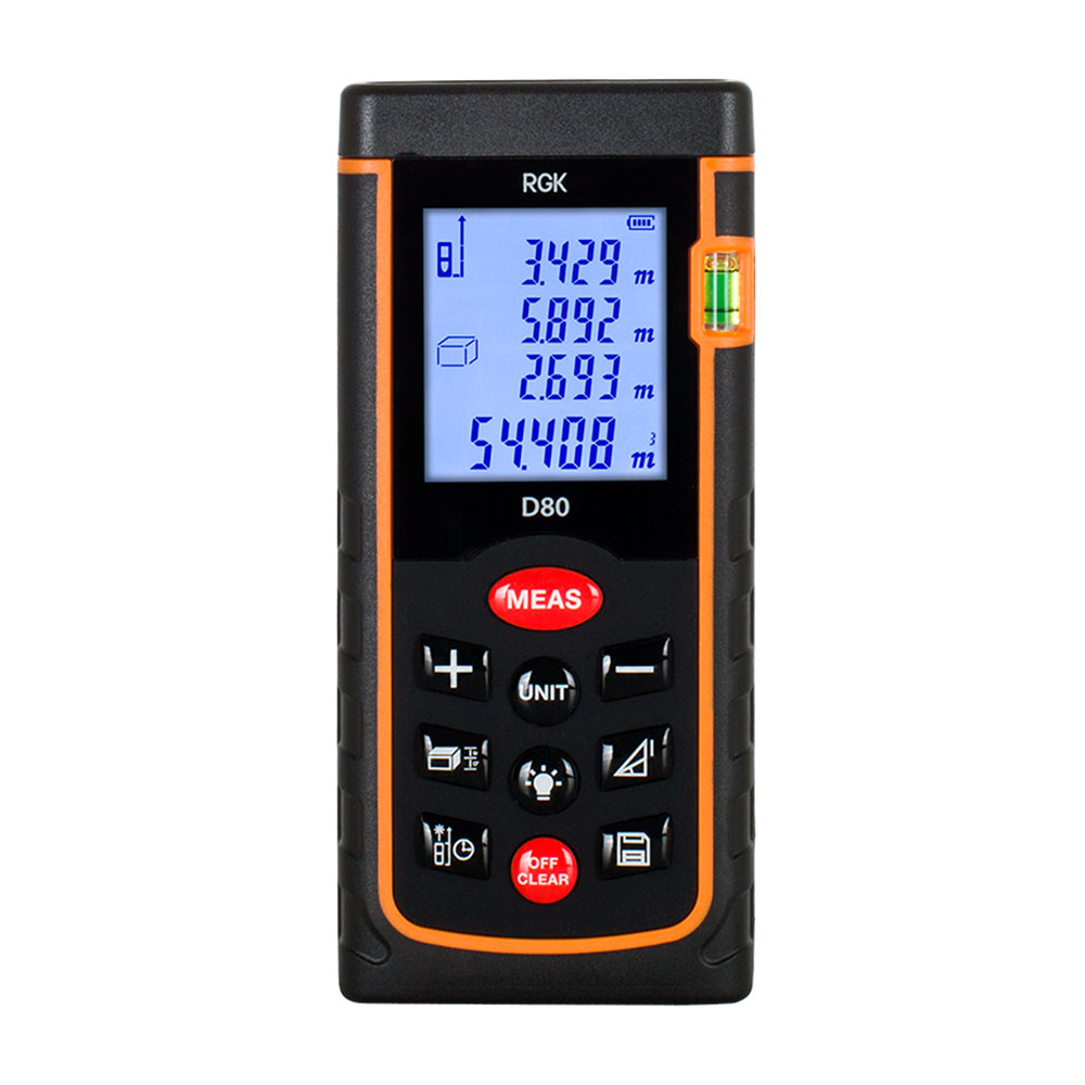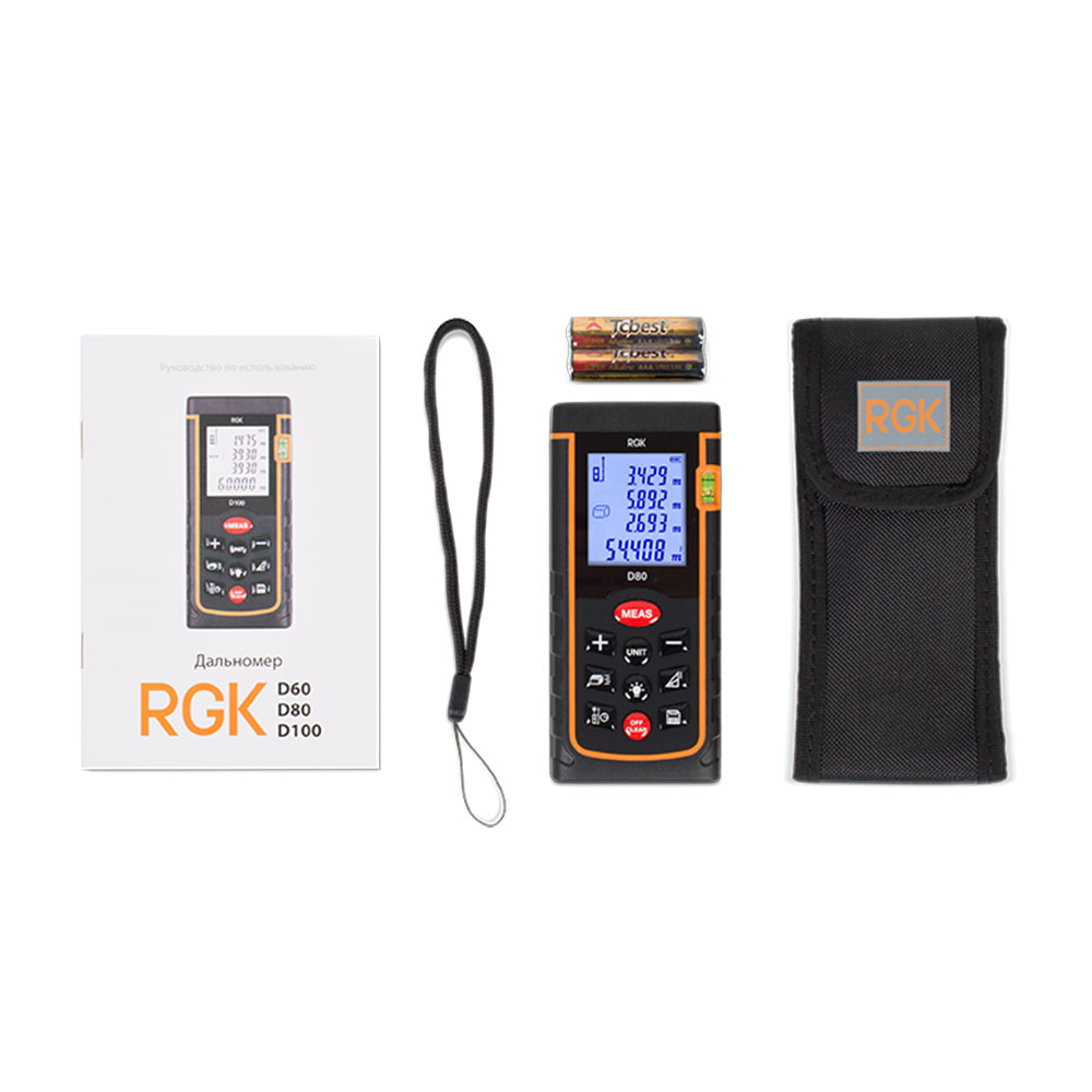 Лазерный дальномер RGK D80 — универсальный измеритель расстояния для строителей, архитекторов, инженеров, дизайнеров и других специалистов, работающих с точными планами помещений, зданий и придомных районов.