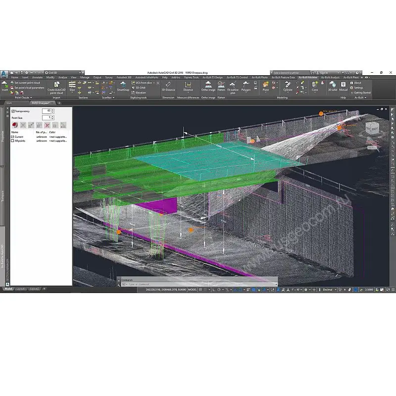 Отклонения построенных CAD-моделей с облаком точек визуализируются в настраиваемых цветовых картах, планах высот или списках и используются для проверки точности моделирования. Выполните автоматическое обнаружение коллизий с данными облака точек непосредственно в AutoCAD, чтобы упростить проверку необходимого перепроектирования запланированного строительства. Другие инструменты анализа включают анализ резервуаров, вычисление масс и объемов.
