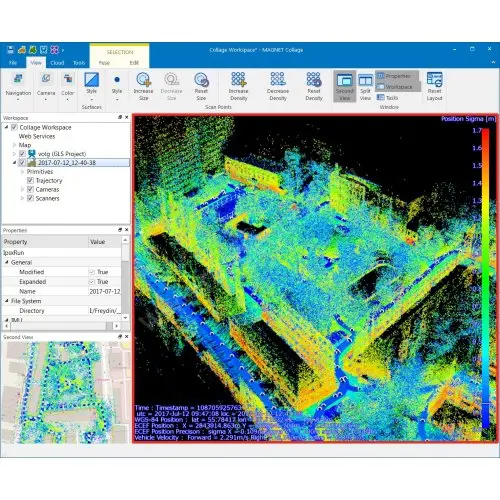 MAGNET Collage – уникальное программное обеспечение позволяющее выполнять обработку данных в одной среде с различных устройств, таких как лазерный сканер Topcon GLS-2000, система мобильного сканирования и картографирования Topcon IP-S3, система сканирования дорожного полотна RD-M1 и беспилотных летательных аппаратов. Программа обладает бесплатным модулем просмотра данных, который может быть запущен без каких-либо средств защиты - MAGNET Collage FreeViewer. Передав клиенту данные сканирования, к ним можно добавить и MAGNET Collage FreeViewer, чтобы обеспечить возможность быстрого и эффективного просмотра данных. При необходимости, чтобы начать работу с полной версией можно воспользоваться USB-ключом. Функция автоматической регистрации данных сканирования MAGNET Collage объединяет данные, полученные с различных точек стояния сканера в единую систему координат, используя в качестве связующих точек специальные марки, поставляемые со сканером. Также автоматически может происходить регистрация данных с использованием известных координат точки стояния сканера и точки обратного ориентирования. Даже если сканирование производилось без использования марок, MAGNET Collage справится с задачей регистрацией только по облакам точек (без марок). Обработка данных в программе MAGNET Collage включает в себя набор функций, предоставляющий пользователю возможности создания чертежей, трехмерных элементов, сечений, поперечников, моделей сложных поверхностей. Вычислительные функции позволяют производить измерения расстояний и углов, рассчитывая как трехмерные значения, так и проекции элементов на координатные плоскости. Для подсчета объема земляных работ в программе присутствует функция подсчета с определением границ области. При работе с таким графическими примитивами, как полилинии, можно использовать функции обрезки, сглаживания, объединения и разбиения. Отличительной чертой программного обеспечения MAGNET Collage является его возможность использовать данные с различных приборов (с системы лазерного мобильного сканирования и фотографирования Topcon IP-S3, наземного лазерного сканера Topcon GLS-2000 и с беспилотных летательных аппаратов) для получения в конечном итоге необходимой информации.