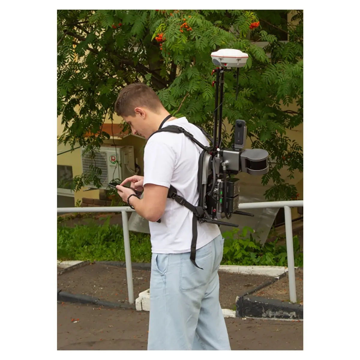 Носимый на плечах рюкзак позволяет свободно перемещаться по сложным ландшафтам, что делает его идеальным для работы в условиях, где традиционные методы сканирования могут оказаться неэффективными. Благодаря быстросъемным механизмам, сканер может быть легко отсоединен от рюкзака и использован как ручная система или установлен на автомобиль или беспилотный аппарат.