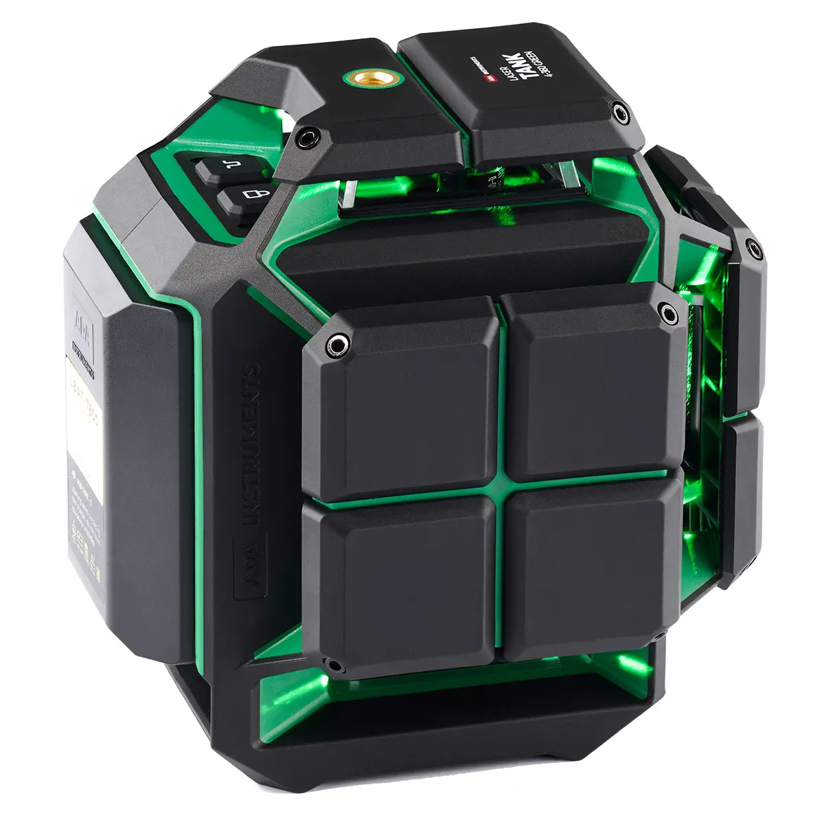 Две точки крепления. ADA LaserTANK 4-360 GREEN можно крепить к штативу или настенному креплению при помощи резьбового соединения 1/4 дюйма. Одна резьба расположена сверху, вторая — снизу. Прибор можно установить на штативе или на универсальном креплении.