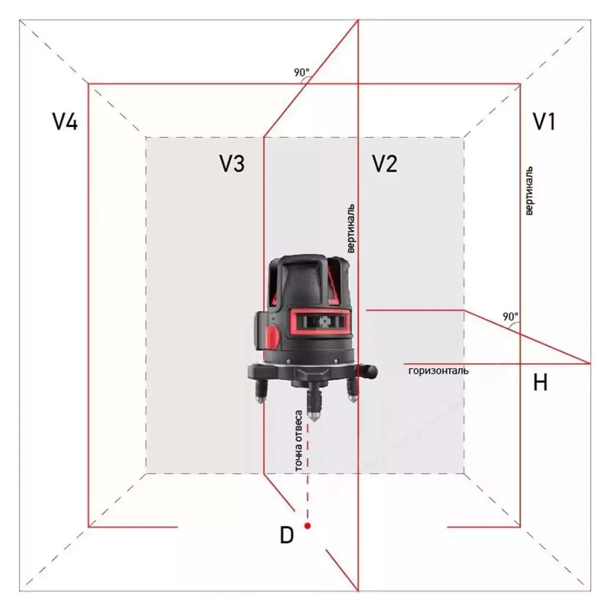 Лазерный уровень ADA PROLiner 4V проецирует горизонтальную линию на 140° и 2 вертикальные на расстоянии до 70 метров с приемником. Лазерный отвес поможет установить прибор в нужной точке помещения, например, в центре комнаты.