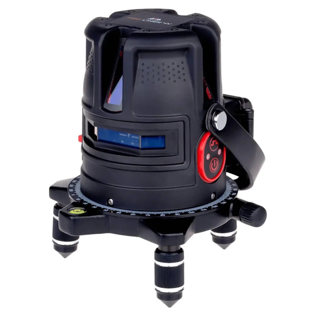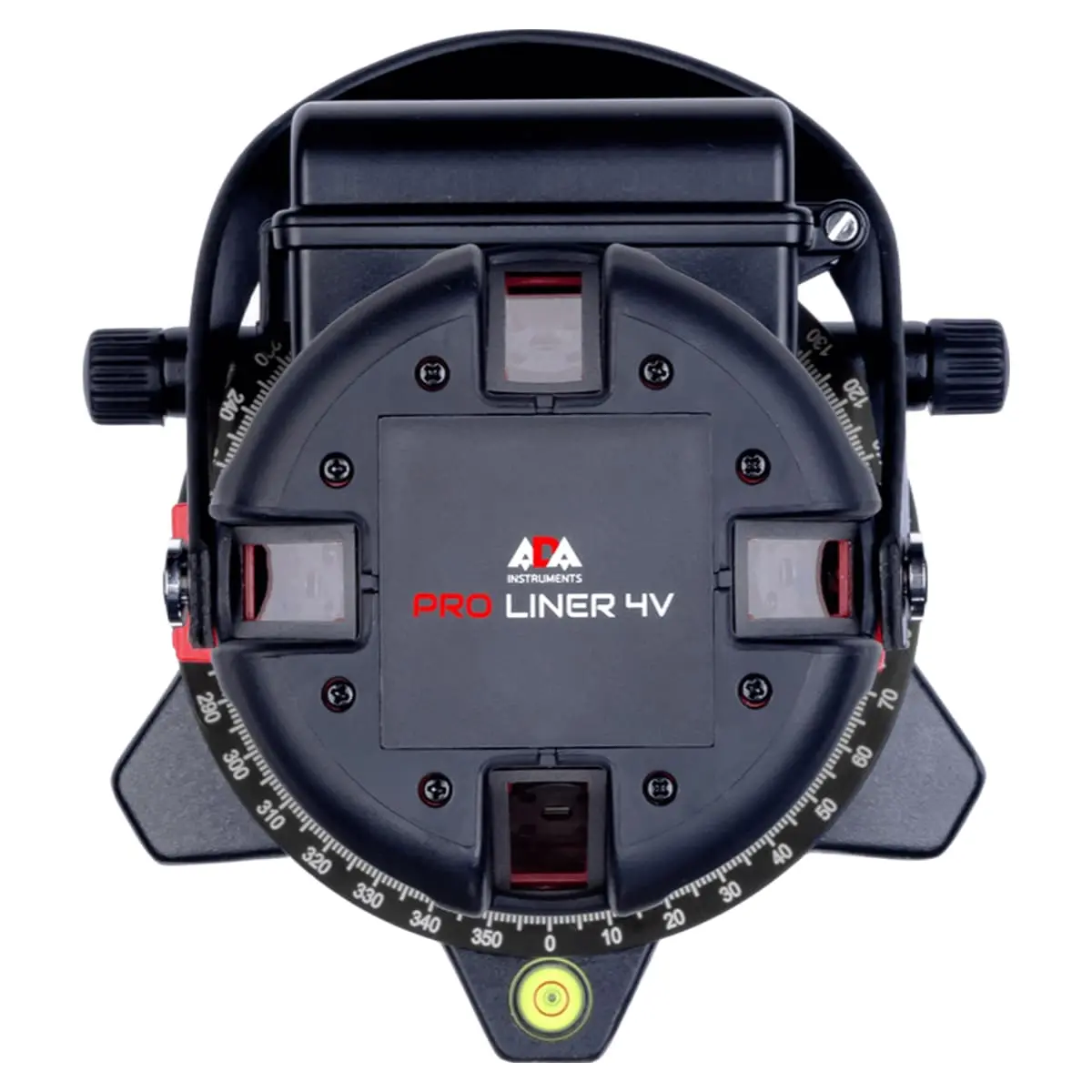 Поворотное основание. В основании корпуса расположена поворотная часть для плавного и точного наведения вертикальных линий. В поворотном механизме используются подшипники плавного скольжения, с высокой осевой точностью. Благодаря этому достигается отличная точность, мягкость и плавность поворота прибора вокруг оси. Ручкой плавной подстройки лазерный нивелир ADA PROLiner 4V поворачивается на 360° вокруг своей оси. Наведение на нужную точку точное и простое.