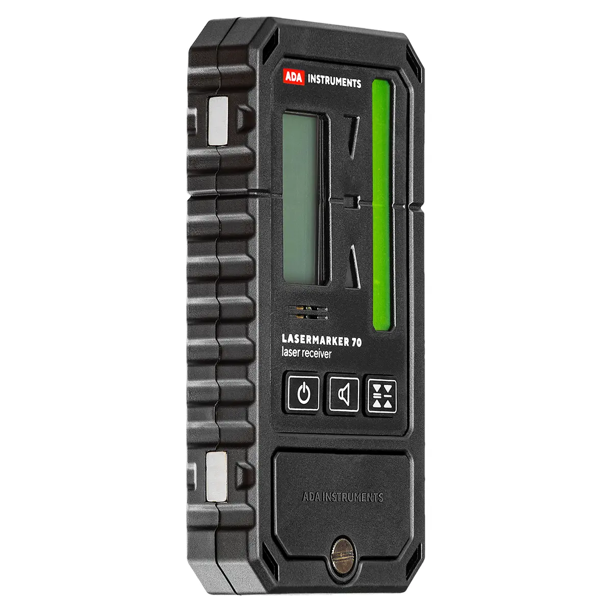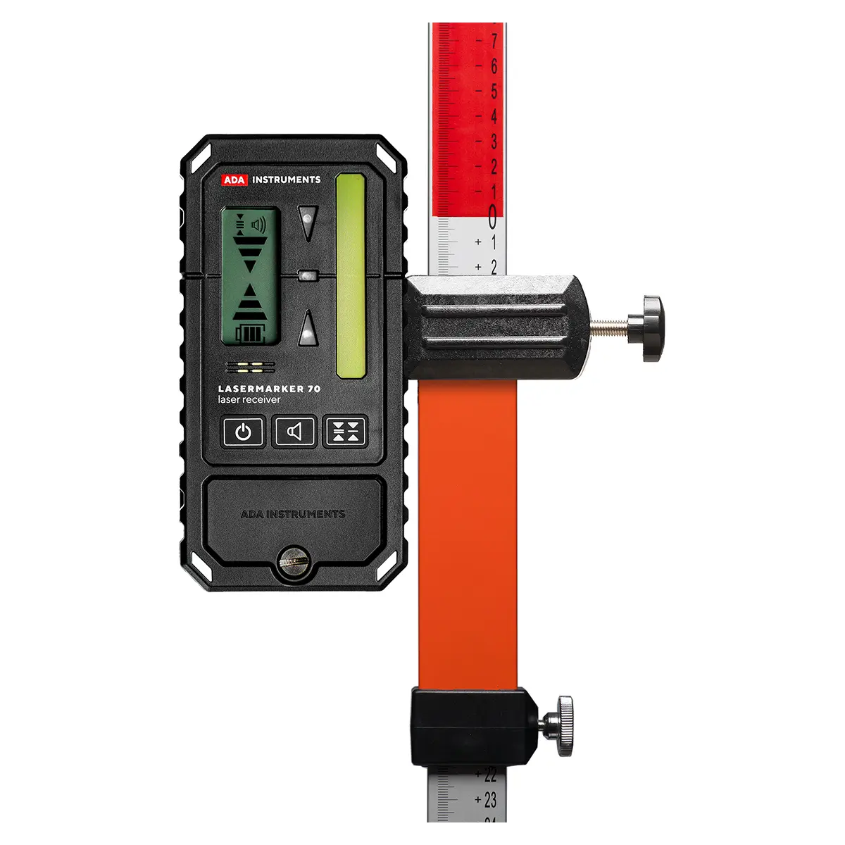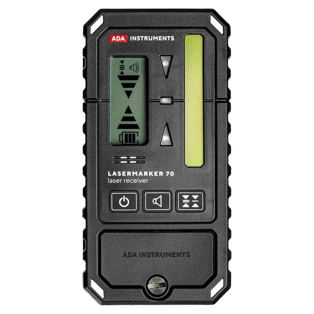 Приемник ADA LASERMARKER 70 распознает лазерные лучи зеленого и красного цвета. Большая (7 см) зона приемного элемента способствует быстро и уверенно обнаруживать положение лазерного луча.