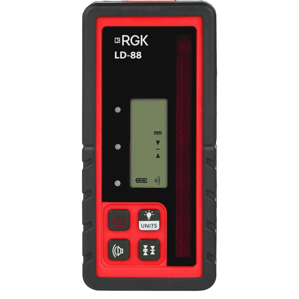 В передней части приемника лазерного луча RGK LD-88 имеются светодиоды, которые сигнализируют об отклонении приемника от нулевой отметки. Они могут светиться оранжевым, если луч находится выше и красным – если ниже. О выравнивании по нулю свидетельствует зеленый светодиод. Это облегчает процесс использования приемника. Кроме того, имеется звуковая индикация режимов.