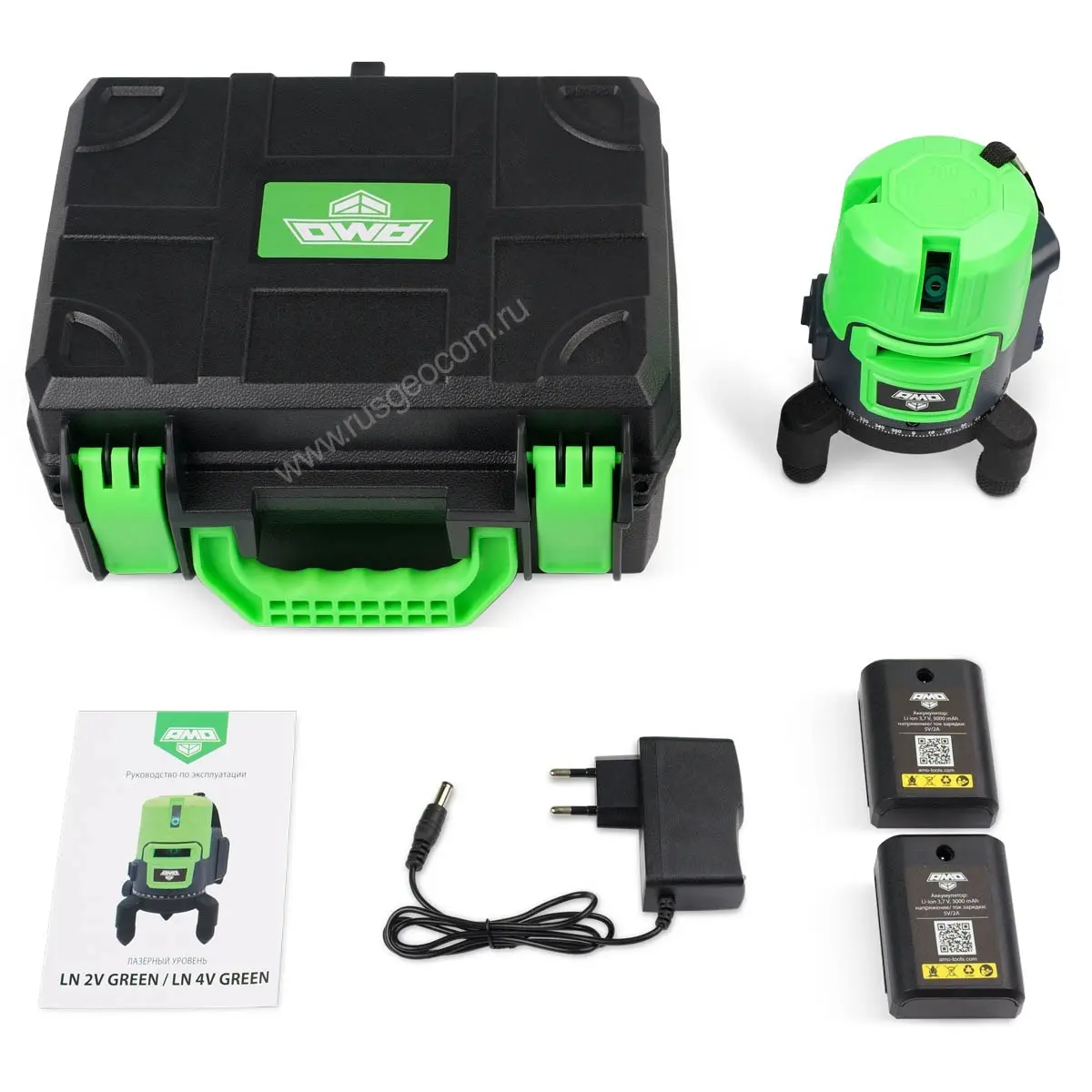В комплект поставки лазерного нивелира АМО LN 2V входят два аккумулятора, заряда которых хватит на целый рабочий день. При необходимости устройство можно подключить к сети и продолжить работу, если батареи разрядились.
