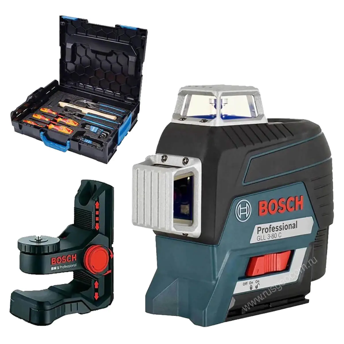 Приобретая данную модификацию лазерного уровня Bosch GLL 3-80 C, вы получаете не только высокоточный лазерный нивелир, но и комплект ручного инструмента в составе: 4 отверток, 2 набора шестигранных ключей, клещей, разводного ключа и молотка. Все инструменты хранятся в удобном кейсе, что упрощает их транспортировку.