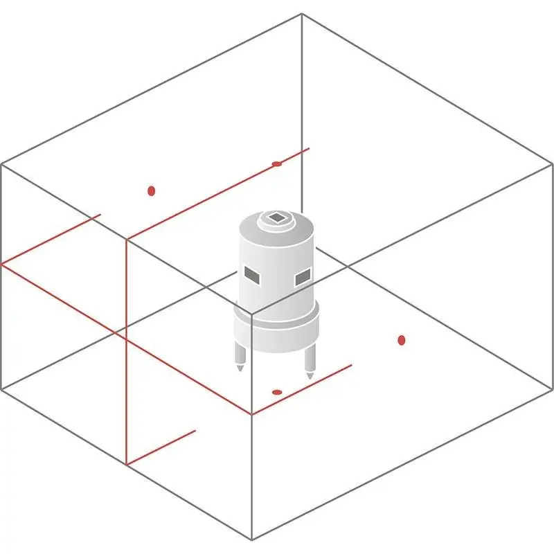 Лазерный нивелир Geo-Fennel CrossPointer 5 SP создает горизонтальную плоскость с развёрткой на 155° и вертикальную на 160°. Кроме этого, он проецирует 5 точек: назад, влево, вправо, вверх и вниз. Разметка точками необходима при работе, где надо совмещать отверстия между стенами. Это может быть прокладка труб отопления или каналов для кабелей электропроводки.