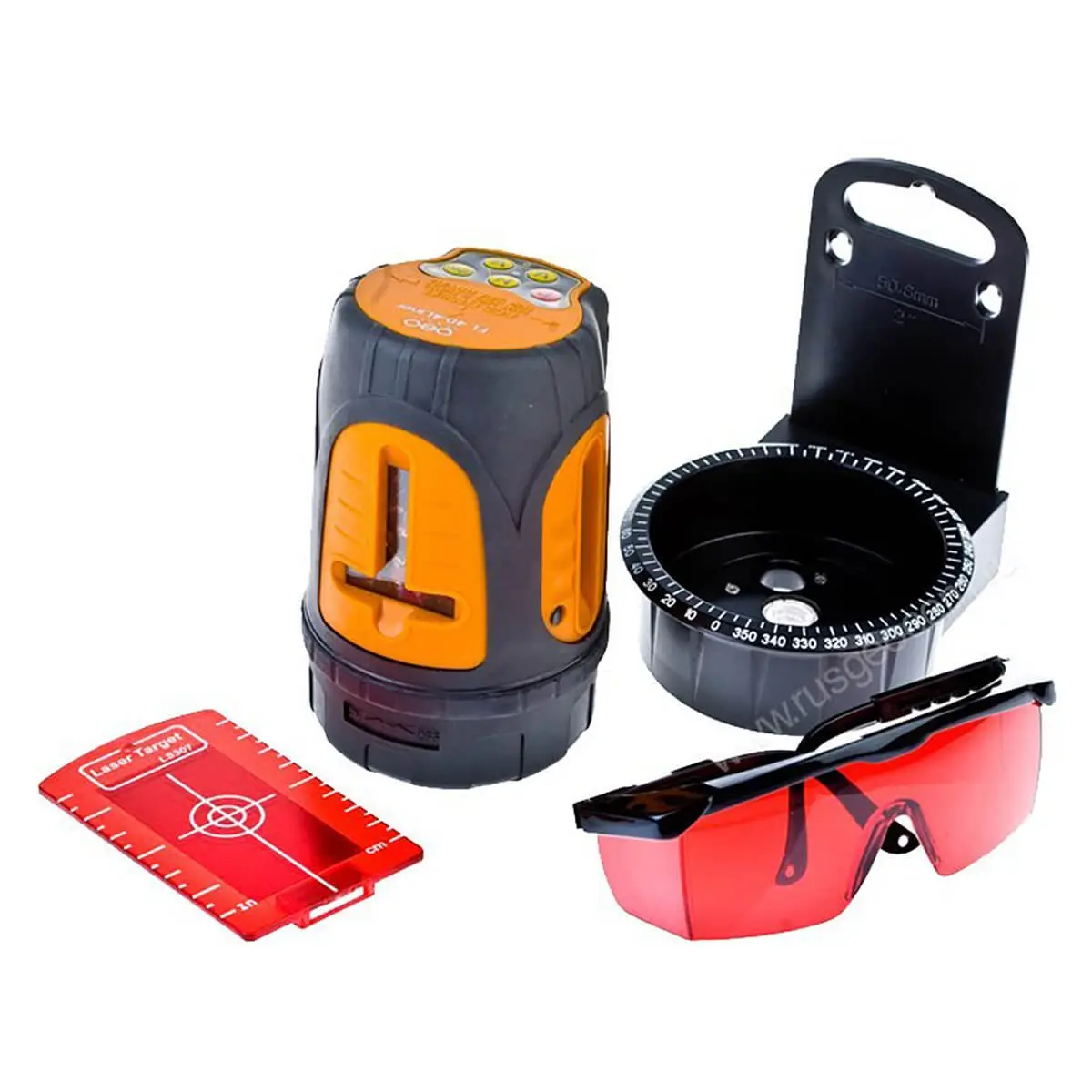 Градусная шкала 360° с шагом 5° расположена на основании прибора. Поворотная конструкция позволяет установить устройство на нужный горизонтальный угол для упрощения разметки.