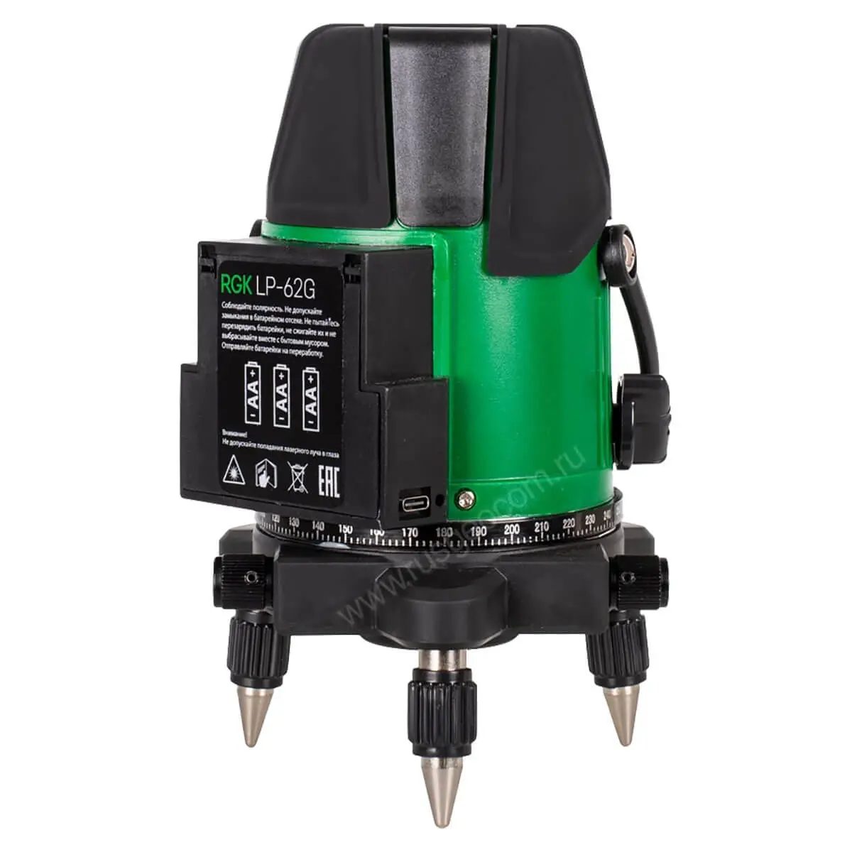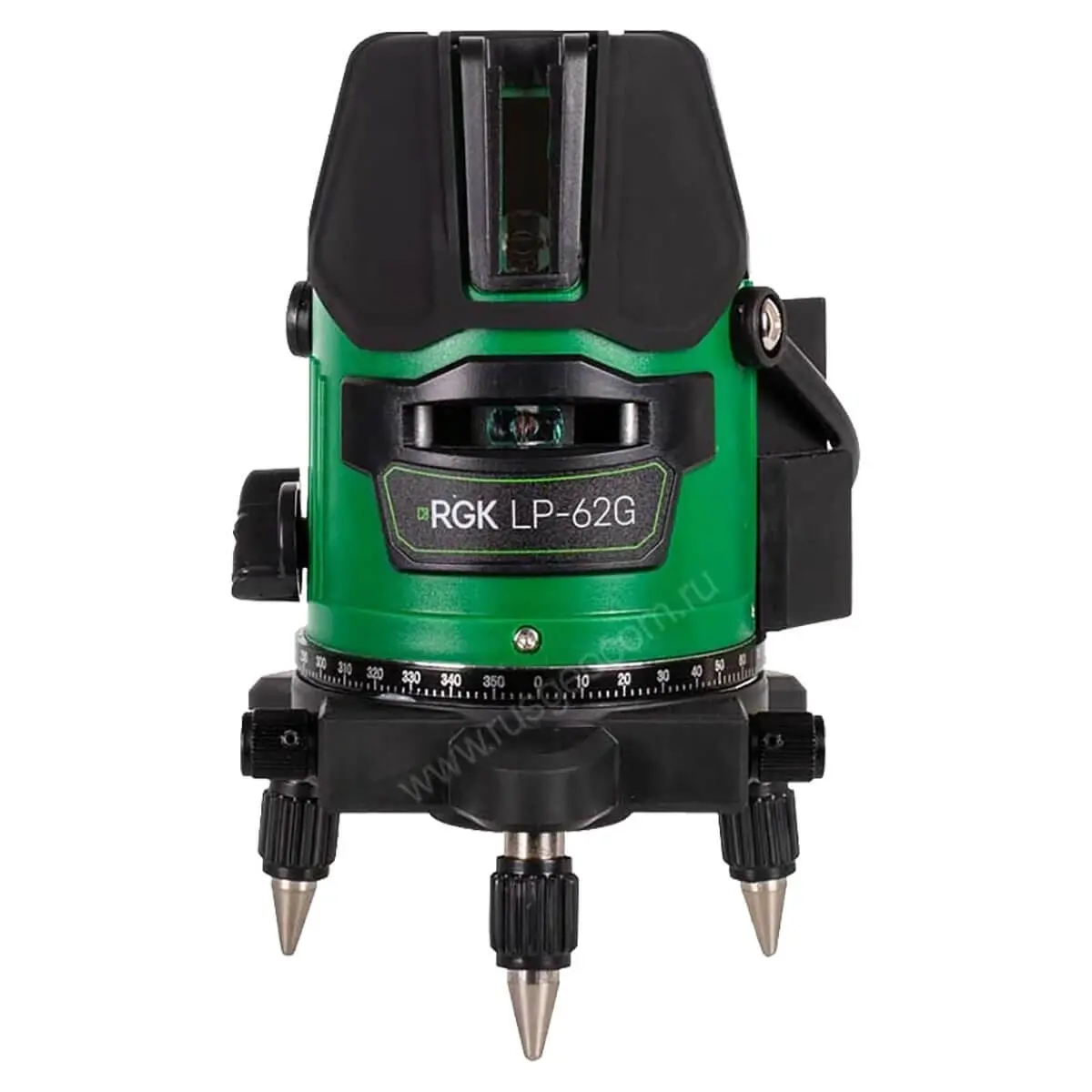 - Встроенный трегер с регулируемыми по высоте ножками. Кроме того, лазерный уровень RGK LP-62G оснащён резьбой 5/8", что позволяет при необходимости ставить его на штатив.