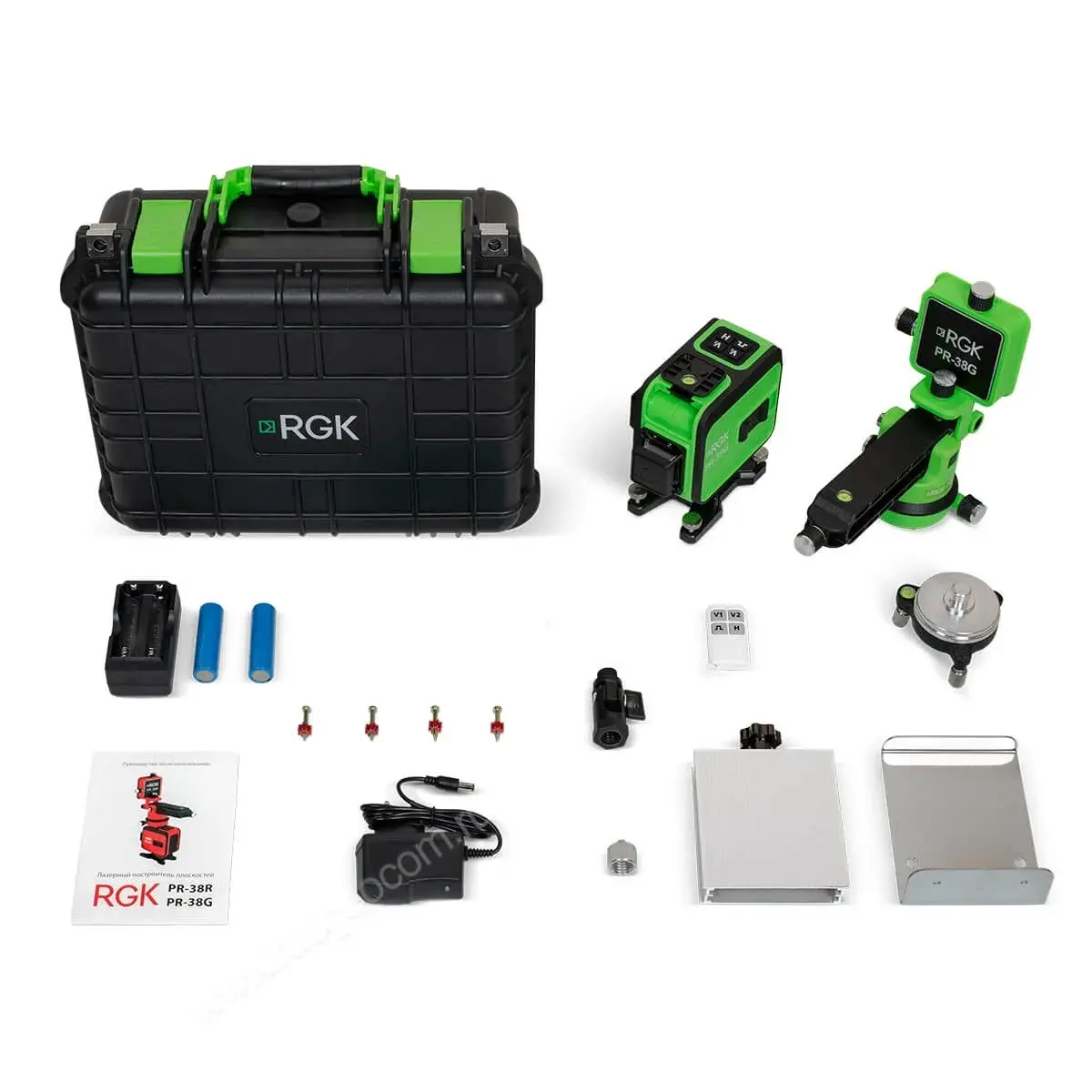 Лазерный построитель плоскостей RGK PR-38G питается от двух аккумуляторных батарей стандарта 18650 емкостью 2600mAh каждая. Зарядка поставляется в комплекте.