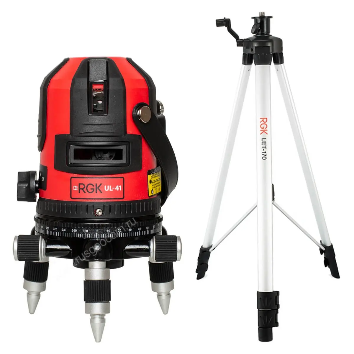 RGK UL-41 строит четыре вертикальных плоскости и горизонтальную с развёрткой 110°, благодаря чему устройство может охватить все стены помещения с одной позиции. Поворотный корпус UL-41 с двумя винтами наводки снабжен горизонтальным лимбом и позволяет аккуратно и точно перенести плоскость на нужную поверхность. Лазер UL-41 обеспечивает чёткую линию на любой поверхности на дистанции до 20 метров в помещении, а с использованием приемника лазерного излучения дистанция возрастает до 50 метров с возможностью использования прибора при ярком освещении. Точность построения линии составляет 0,2 мм на 1 м.