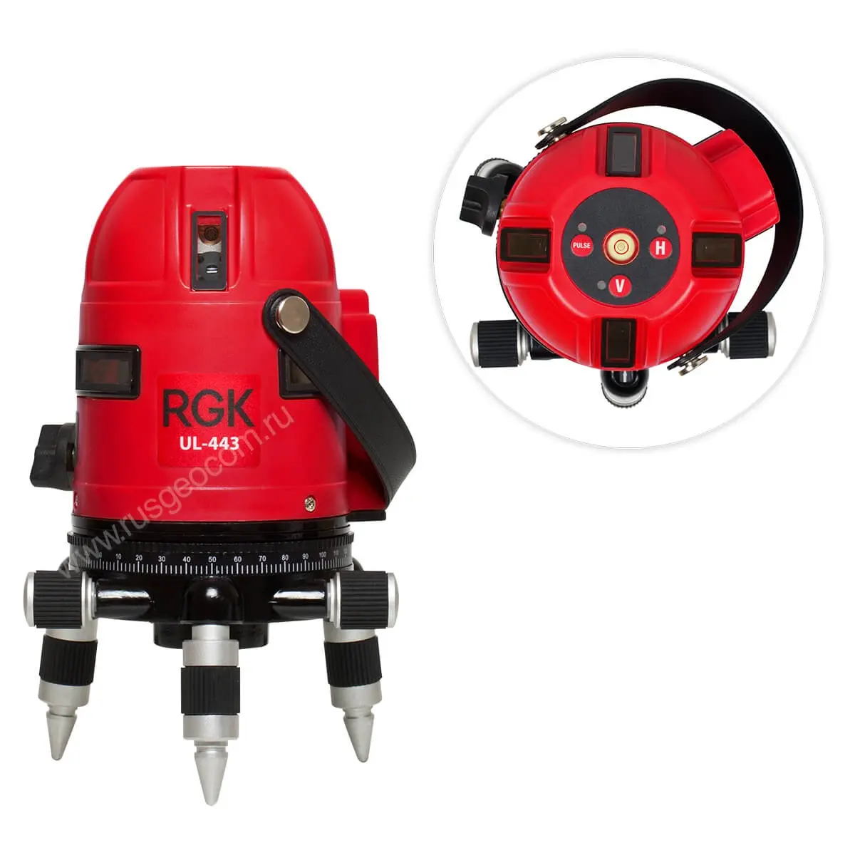 Отличительной особенностью лазерного нивелира RGK UL-443 является угол развертки в горизонтальной плоскости 360°. Прибор строит одну горизонтальную и четыре вертикальные плоскости, имеется возможность включения всех плоскостей одновременно или поочередно.
