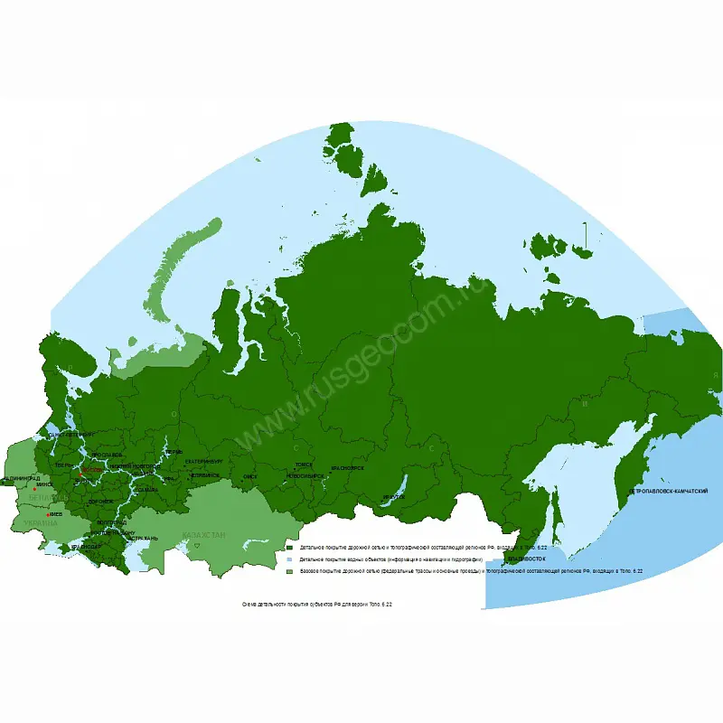Карты "Дороги России. РФ. ТОПО." - уникальны тем, что совмещают в себе три отдельных продукта. Во-первых, это карты дорог с адресной маршрутизацией и поиском, во-вторых, это топографические карты с высотами и типами растительности, в-третьих, это карты глубин внутренних водоемов с навигационной информацией и водной инфраструктурой. В карты включено полное покрытие Российской Федерации. Карты регулярно обновляются.