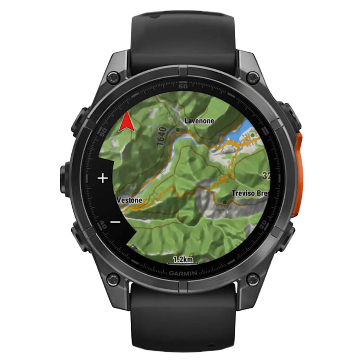 Для навигации часы Garmin Fenix 8 Slate Gray 47mm снабжены компасом, барометром и альтиметром-высотомером, а также ГНСС модулем с режимом Multi-Band, обеспечивающим точное позиционирование в сложных условиях для прохождения спутникового сигнала. Поддерживается полноценная картография, в том числе с возможностью работы с данными TopoActive с рельефной штриховкой. Реализована функция динамического построения маршрута, с возможностью выбора альтернативных путей для выхода к выбранному пункту при отклонении от трассы и возвращения.
