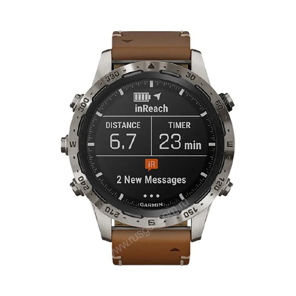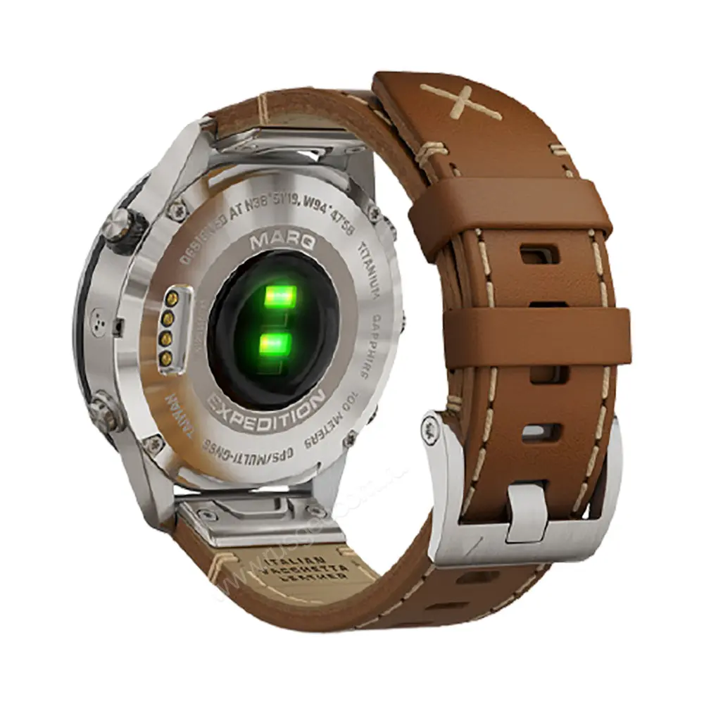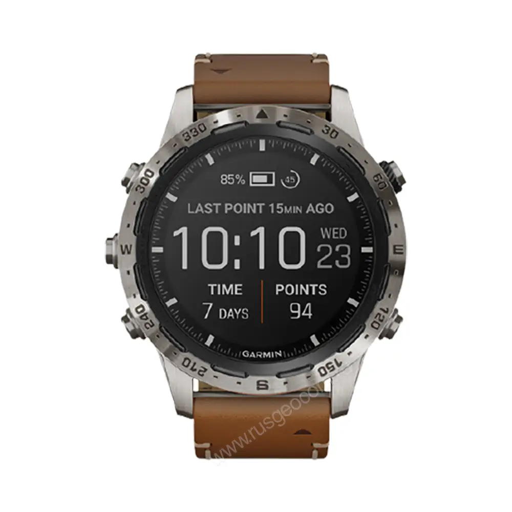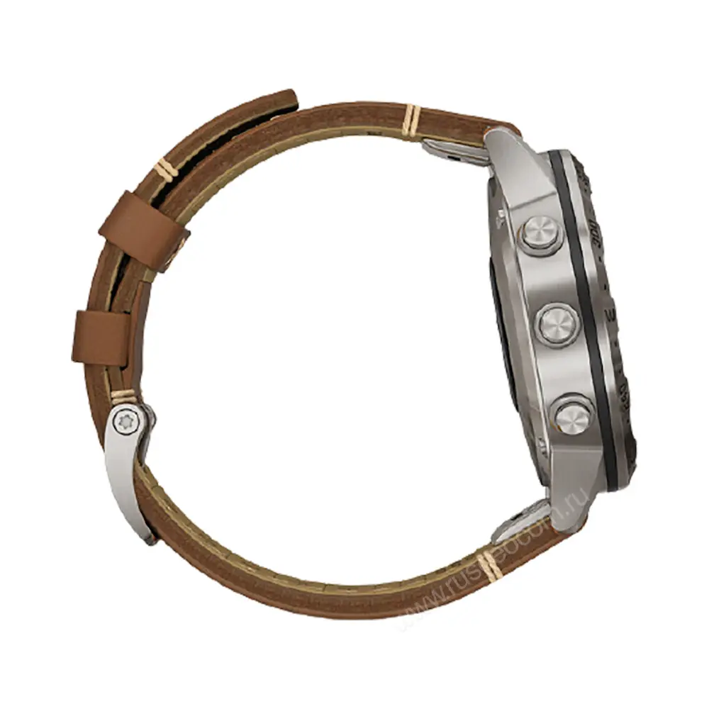 Благодаря изысканному дизайну, стилизованному под винтажную классику экспедиционных приборов, спортивные часы подчеркивают любовь владельца к путешествиям и приключениям. Garmin MARQ Adventurer снабжены облегченным титановым корпусом с сапфировым стеклом и безелем с 360-градусной шкалой, воспроизводящей лимб компаса. Завершает образ прошитый вручную ремешок из элитной итальянской кожи светлого цвета. Быстросъемный крепеж QuickFit позволяет легко менять браслет без использования инструментов, например, на силиконовый ремень из комплекта поставки перед занятиями плаванием.