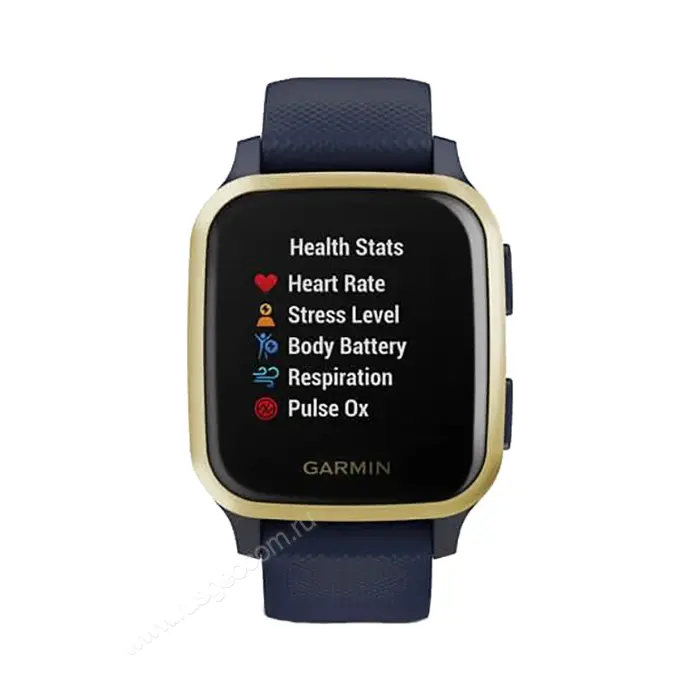 Часы Garmin Venu Sq Music Edition темно-синий с золотистым алюминиевым безелем и ярким цветным экраном выглядят как обычные смарт-часы, в отличие от специализированных модификаций. При этом устройство отлично подходит как для повседневного использования, за счет бесконтактной оплаты покупок и воспроизведения музыки, так и для активного образа жизни, вести который помогают функции наблюдения за здоровьем, предустановленные профили для тренировок, спортивные рекомендации и др.