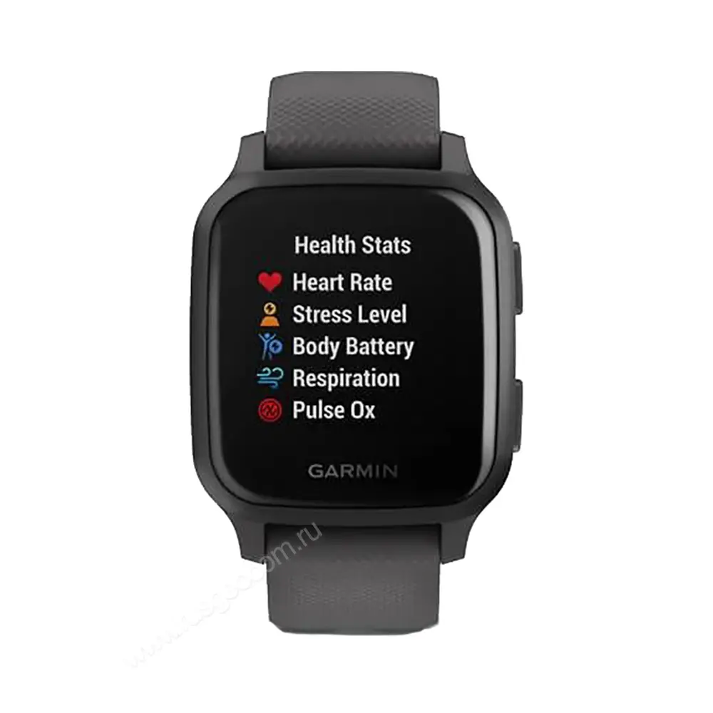 Часы Garmin Venu Sq оборудованы пульсометром и датчиком сатурации крови, что позволяет контролировать параметры здоровья и активности. Функции отслеживания уровня стресса и контроля энергии организма помогают спланировать режим дня оптимальным образом.