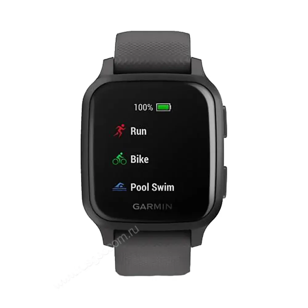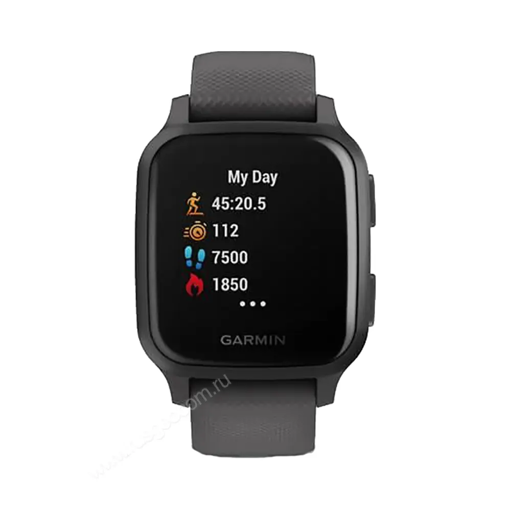 Часы Garmin Venu Sq серый с алюминиевым безелем и с силиконовым ремешком - удобные и стильные смарт-часы на каждый день, которые отличаются от специализированных моделей бренда более ярким, насыщенным изображением и универсальным стильным дизайном.