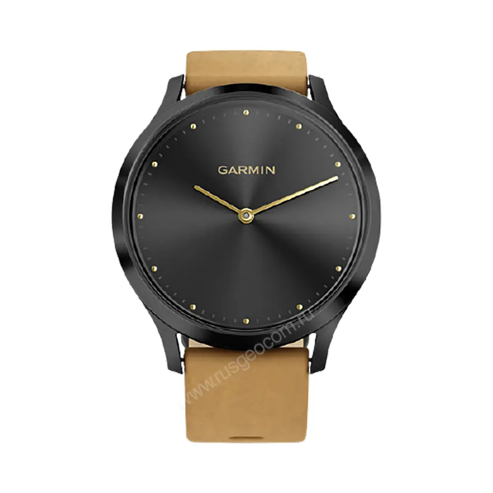Часы Garmin Vivomove HR Premium черный оникс с светло-коричневым кожаным ремешком совмещают в себе стильное оформление престижного аксессуара с функциональностью полноценного фитнес-браслета с мониторингом состояния ресурсов организма. Скрытый электронный OLED-дисплей с отображением виджетов активируется двойным нажатием на циферблат с аналоговыми стрелками. В спектр функций устройства входит отслеживание таких показателей, как количество сожженных килокалорий, уровень стресса, интенсивность нагрузки, пульс, уровень стресса др.