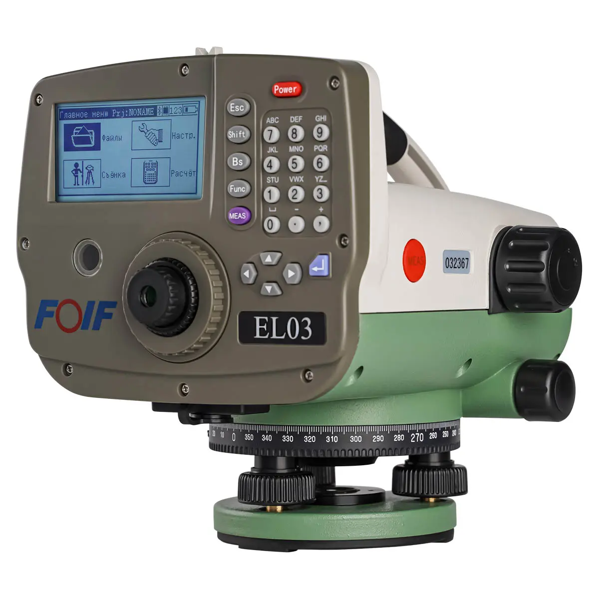 Оснащенный буквенно-цифровой клавиатурой с навигационными клавишами, электронный нивелир FOIF EL03 обладает расширенными возможностями по вводу и редактированию данных через "меню проектов". 30-кратная зрительная система измерителя снабжена 45-миллиметровым объективом с высокой светосилой, для защиты которого от случайных повреждений на корпусе размещен козырек. Продольная верхняя ручка упрощает извлечение изделия из транспортировочного бокса, его переноску в пределах рабочей площадки и установку на штатив. В верхней части оборудования предусмотрен прицельное приспособление, позволяющее предварительно наводить измерительный прибор в направлении точки съемки.