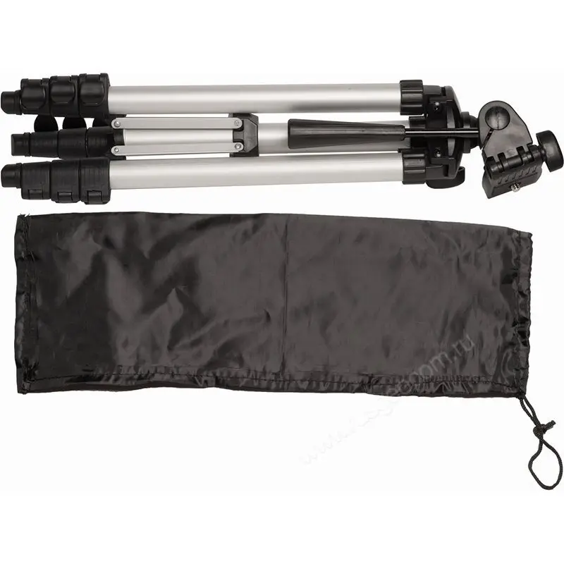 В комплект поставки включены сумка-чехол для переноски, элементы питания и элевационный штатив, который позволяет закрепить нивелир в любом месте на высоте от 35 до 110 см. В штативе есть подвижная колонка, которая дает возможность плавно изменять высоту в пределах 25 см без отключения нивелира.