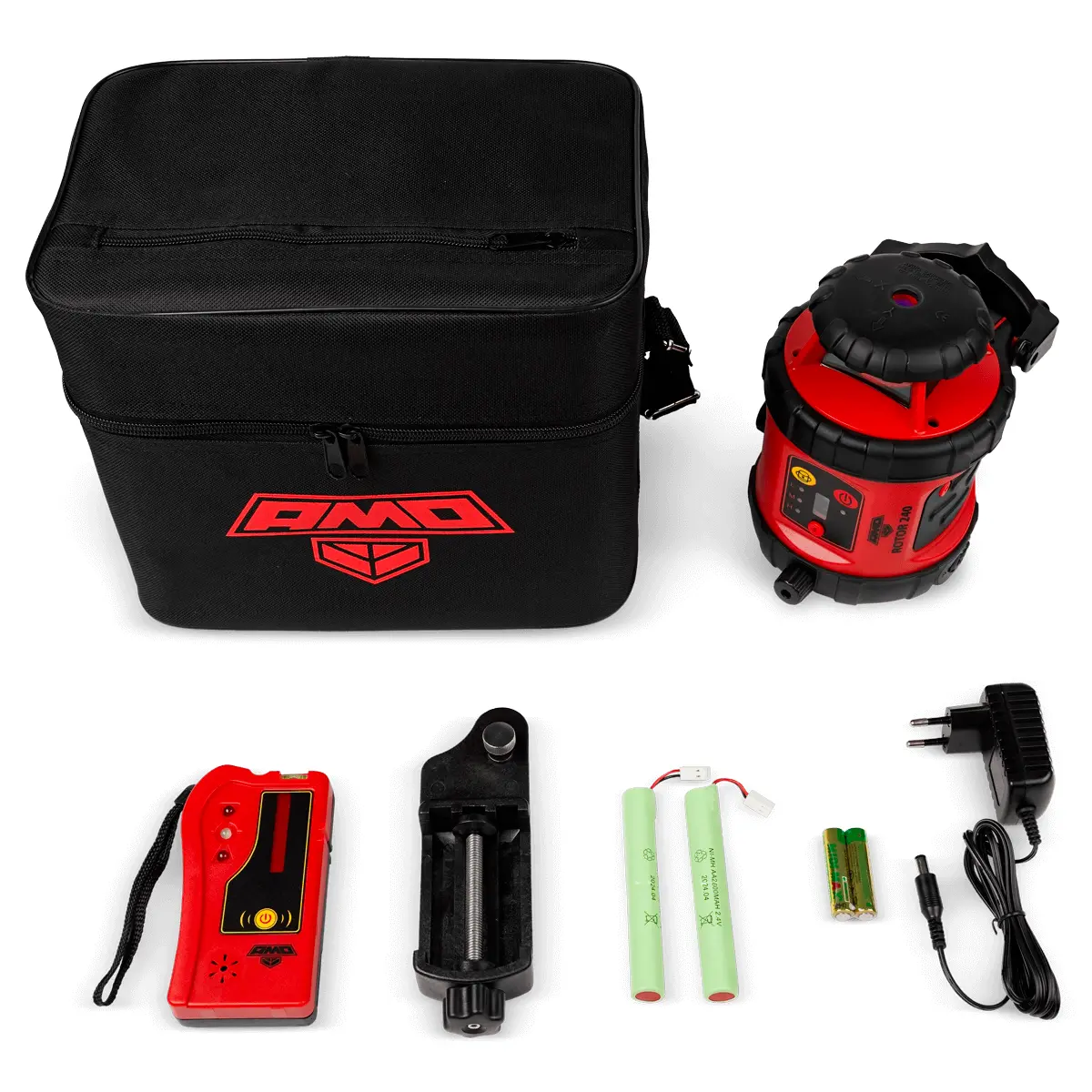 Ротационный лазерный нивелир AMO ROTOR 240 поставляется в расширенной комплектации. В комплект входит: устройство, приемник лазерного излучения, пульт ДУ, кронштейны для вертикальной и наклонной установки. Прибор проецирует горизонтальную плоскость разверткой на 360°, вертикальный луч и точку зенита. Модель оснащена мощным ярким лазером красного цвета, который отлично виден как в помещениях, так и на улице. Дальность действия с приёмником составляет 240 м. Лазерный уровень работает от четырех батареек АА или Ni-MH-аккумуляторов.