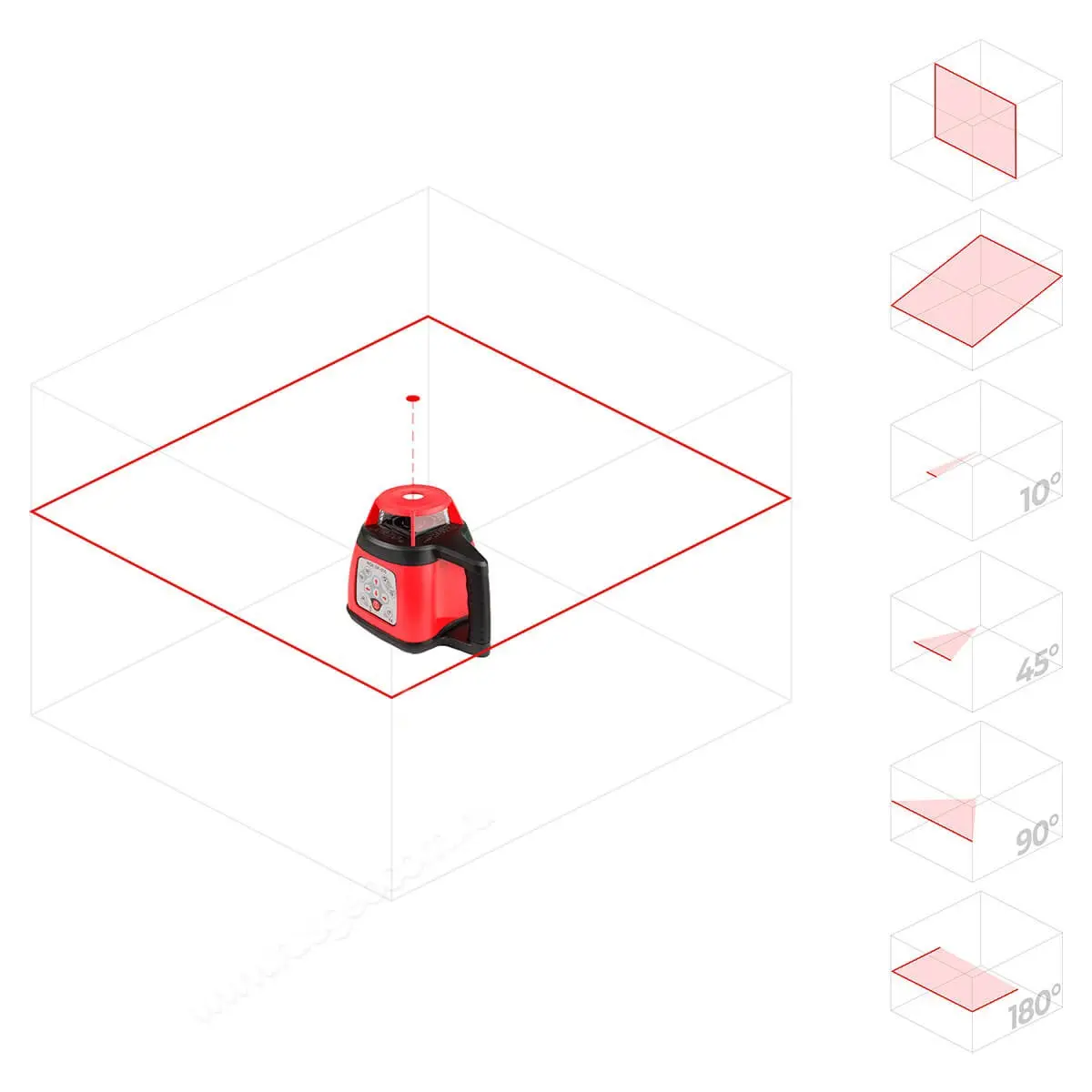 Лазерный нивелир поставляется с расширенным комплектом аксессуаров, повышающих функциональность инструмента. Благодаря приемнику лазерного излучения дальность работы нивелира может достигать 150 метров (300 метров в диаметре), что позволяет использовать прибор для работ на открытом воздухе. Пульт дистанционного управления позволяет осуществлять управление нивелиром на расстоянии. Специальный кронштейн позволяет установить приемник на рейку.